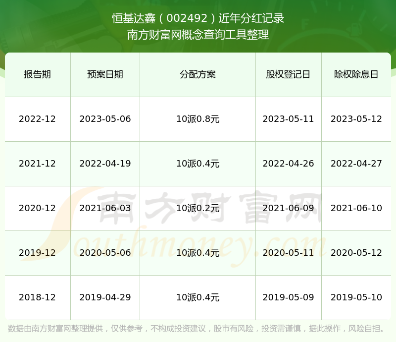 恒基達(dá)鑫最新一次公布的分紅方案為10派0.8元。本次權(quán)益分派股權(quán)登記日為2023年5月11日,除權(quán)除息日為2023年5月12日,派息日為2023年5月12日。