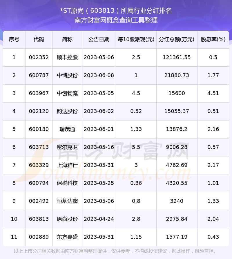 按照南方財富網(wǎng)趨勢選股系統(tǒng)統(tǒng)計,*ST原尚所屬行業(yè)為物流行業(yè)行業(yè),物流行業(yè)行業(yè)分紅排名情況如下表: