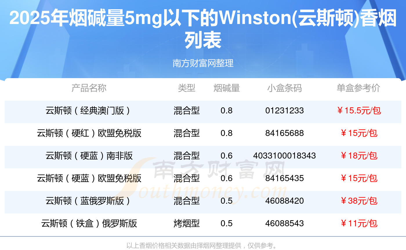 擇煙網(wǎng)為大家盤點(diǎn)了煙堿量5mg以下的Winston(云斯頓)香煙,分別有云斯頓(經(jīng)典澳門版)、云斯頓(硬紅)歐盟免稅版、云斯頓(硬藍(lán))南非版、云斯頓(硬藍(lán))歐盟免稅版、云斯頓(藍(lán)俄羅斯版)、云斯頓(鐵盒)俄羅斯版等,具體價(jià)格如下:
