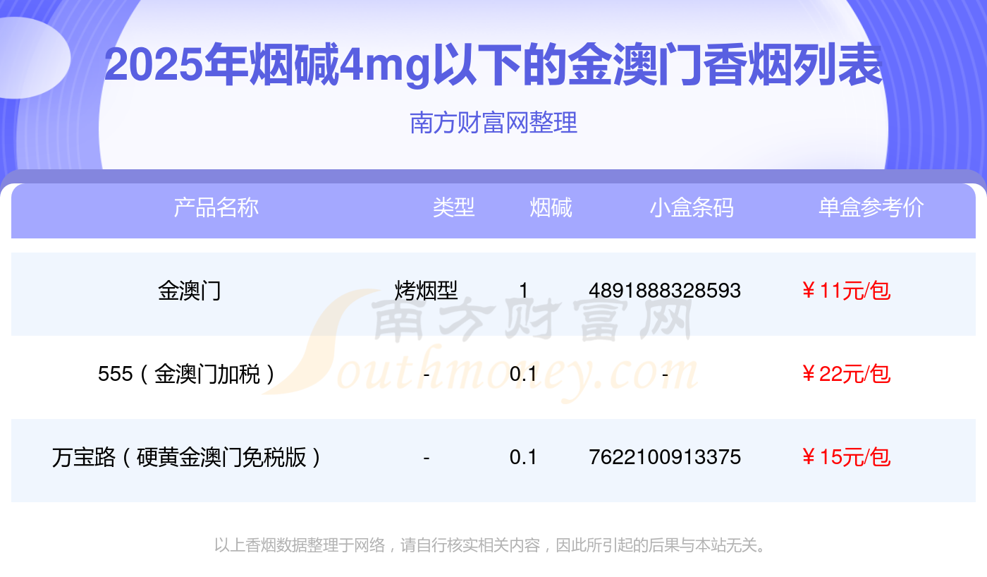 金澳門香煙煙堿4mg以下的煙2025列表一覽
