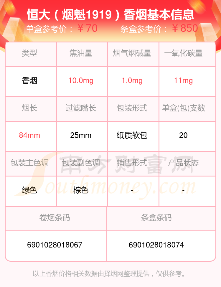 尼古丁低于1mg的恒大香煙有哪些?擇煙網(wǎng)為大家整理盤點,分別有:恒大(煙魁1919)、恒大(全開式煙魁)、恒大(記憶1949)、恒大(硬紅)、恒大(津門)、恒大(軟80)、恒大(硬中支)、恒大(硬2000)、恒大(煙魁1949)、恒大(記憶1949中支)等,具體價格如下:
