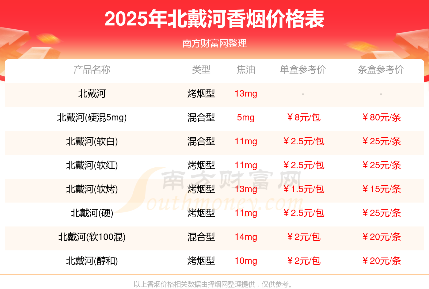 2025年,北戴河(硬混5mg)、北戴河(軟紅)、北戴河(軟白)、北戴河(硬)、北戴河(軟100混)等北戴河香煙價(jià)格如下: