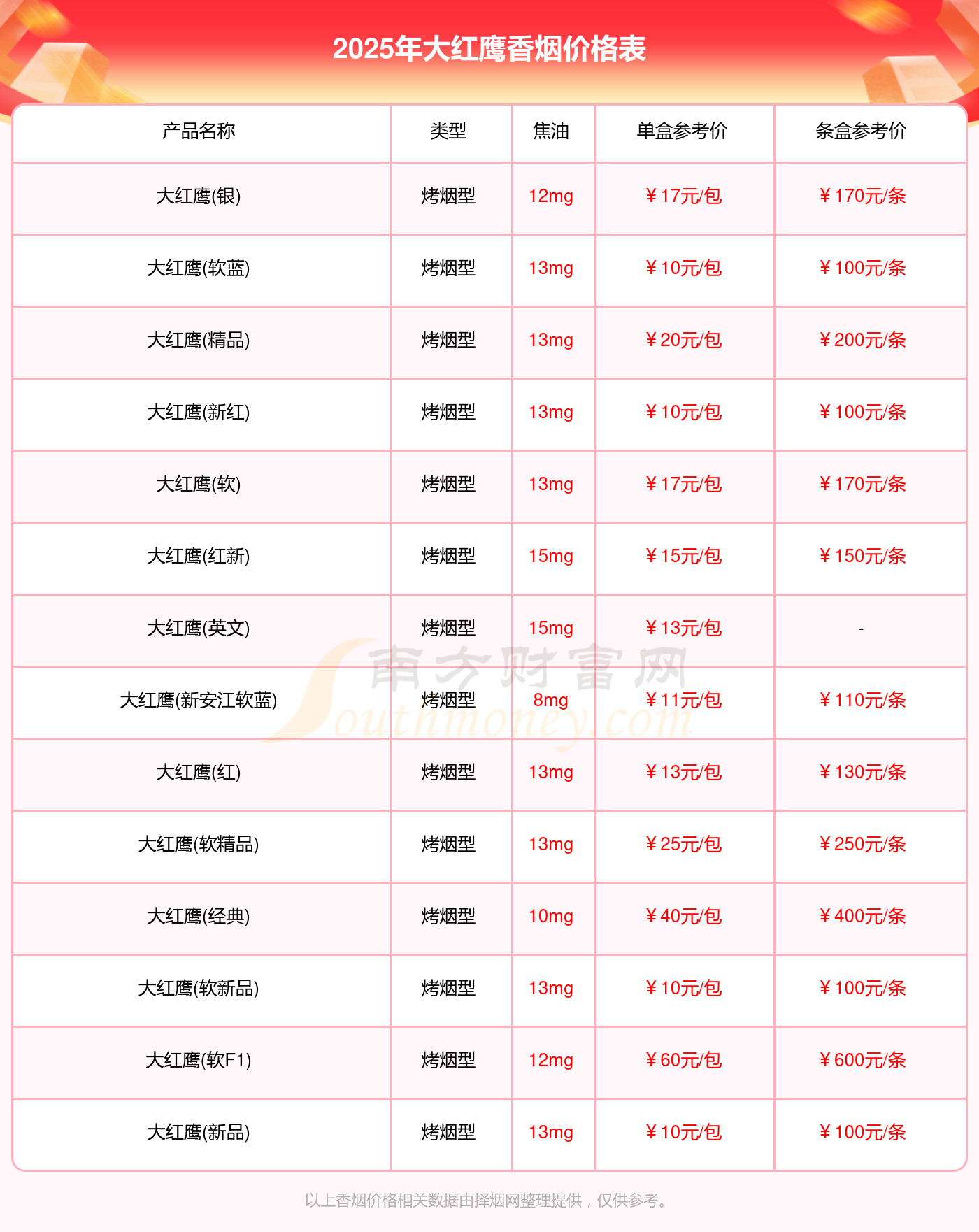 大紅鷹(軟F1)參考價60.0元/包、大紅鷹(經(jīng)典)參考價40.0元/包、大紅鷹(軟精品)參考價25.0元/包、大紅鷹(精品)參考價20.0元/包、大紅鷹(軟)參考價17.0元/包、大紅鷹(銀)參考價17.0元/包、大紅鷹(紅新)參考價15.0元/包。