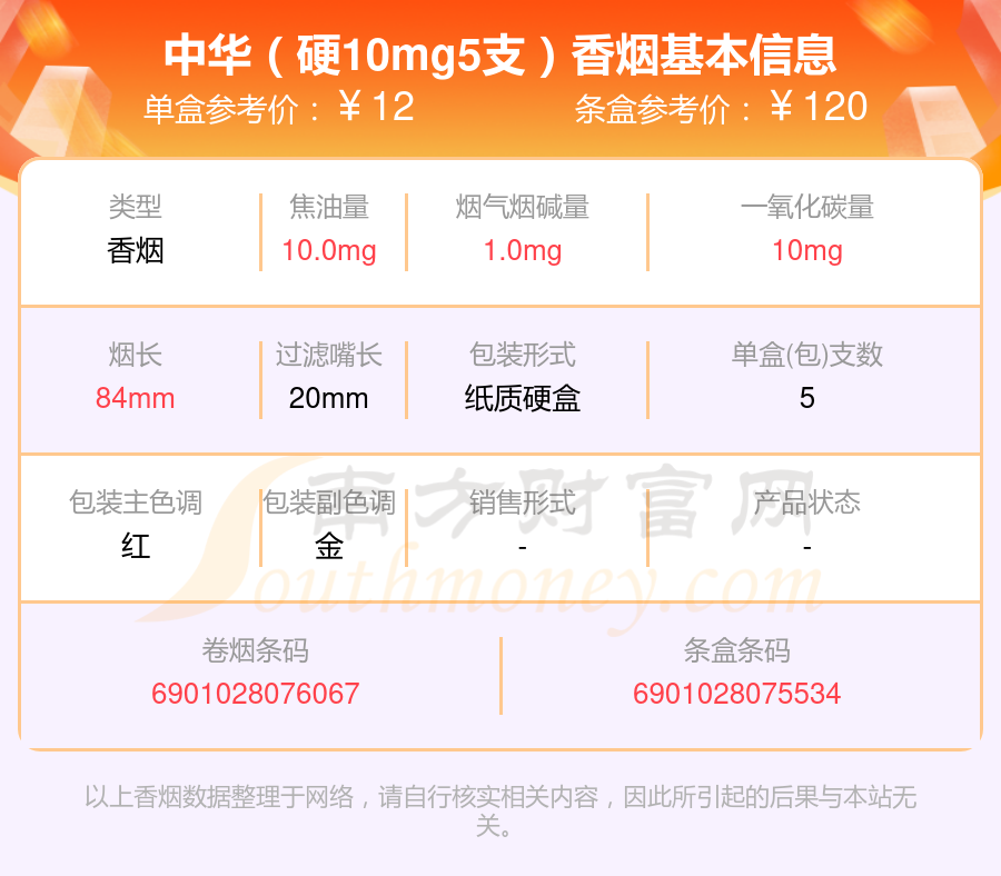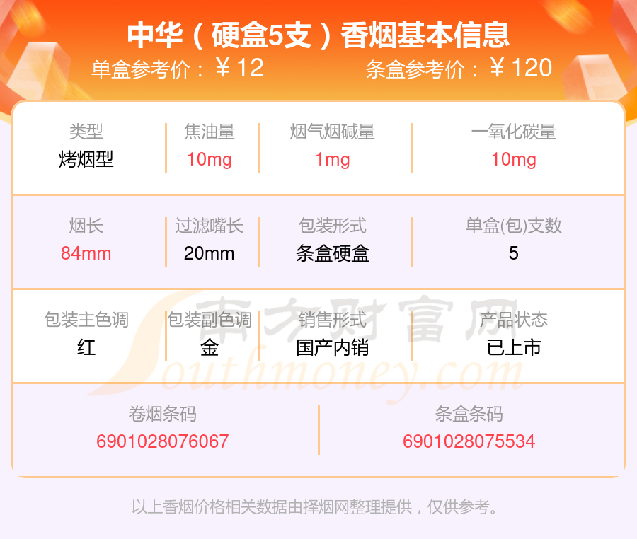 擇煙網(wǎng)為大家盤點了10元至20元的中華香煙,分別有中華(硬10mg5支)、中華(硬5支)、中華(硬盒5支)等,具體價格如下: