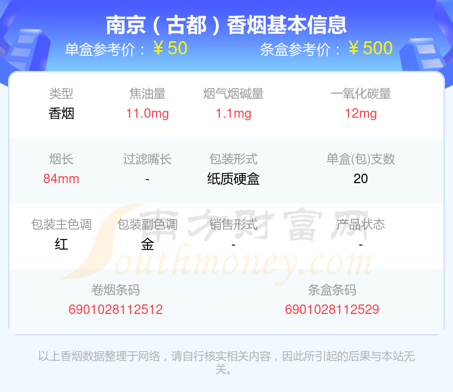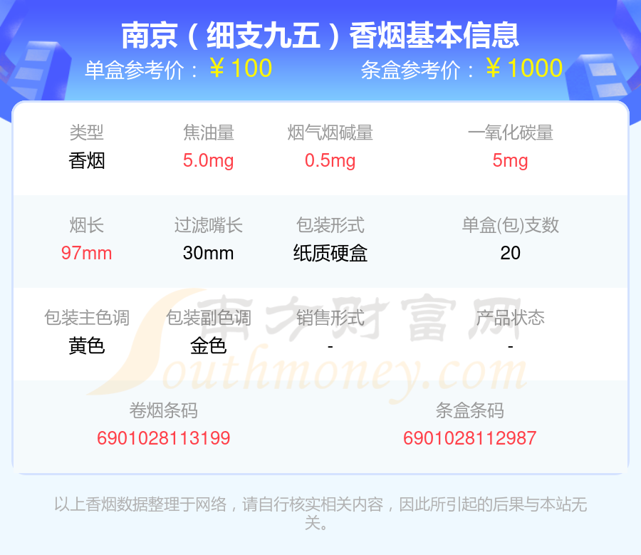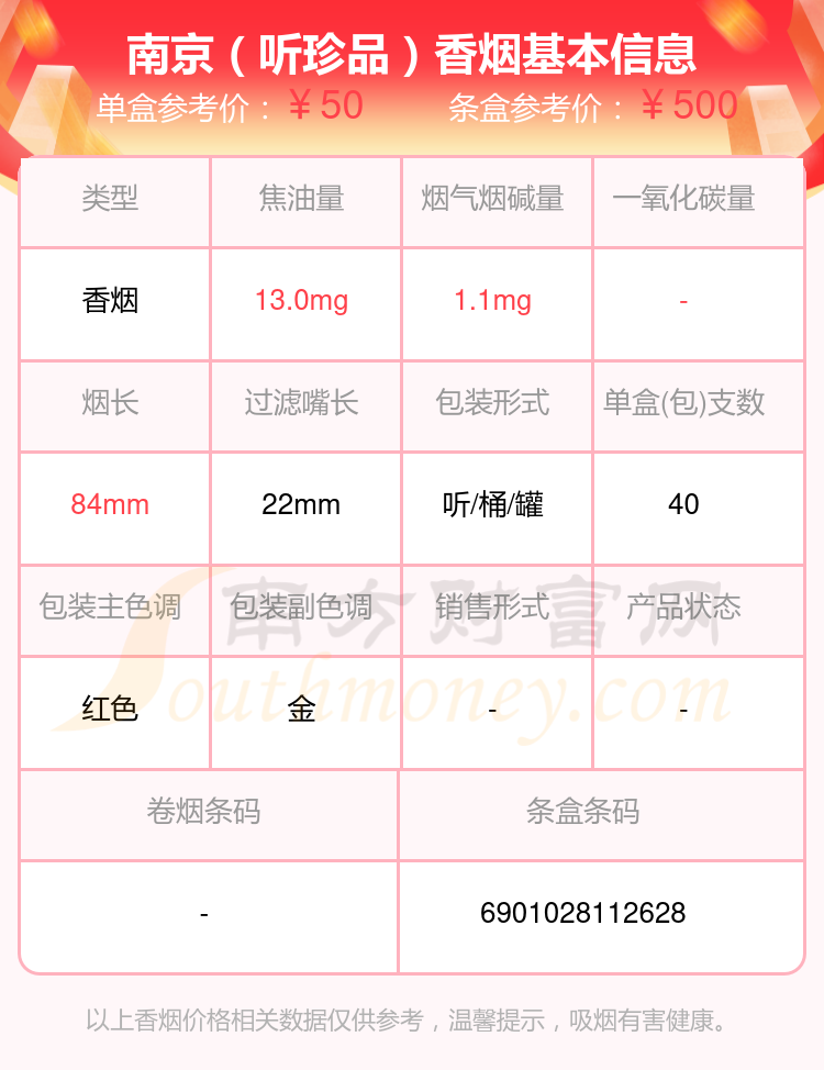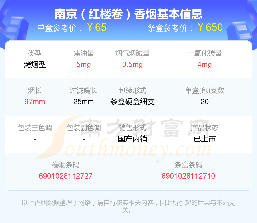 擇煙網(wǎng)為大家盤點(diǎn)了50~100元左右的南京香煙,分別有南京(紅樓卷)、南京(雨花石)、南京(雨花石細(xì)支)、南京(聽珍品)、南京(珍品)、南京(硬珍品)、南京(古都)、南京(九五)、南京(細(xì)支九五)、南京(軟九五)等,具體價(jià)格如下:
