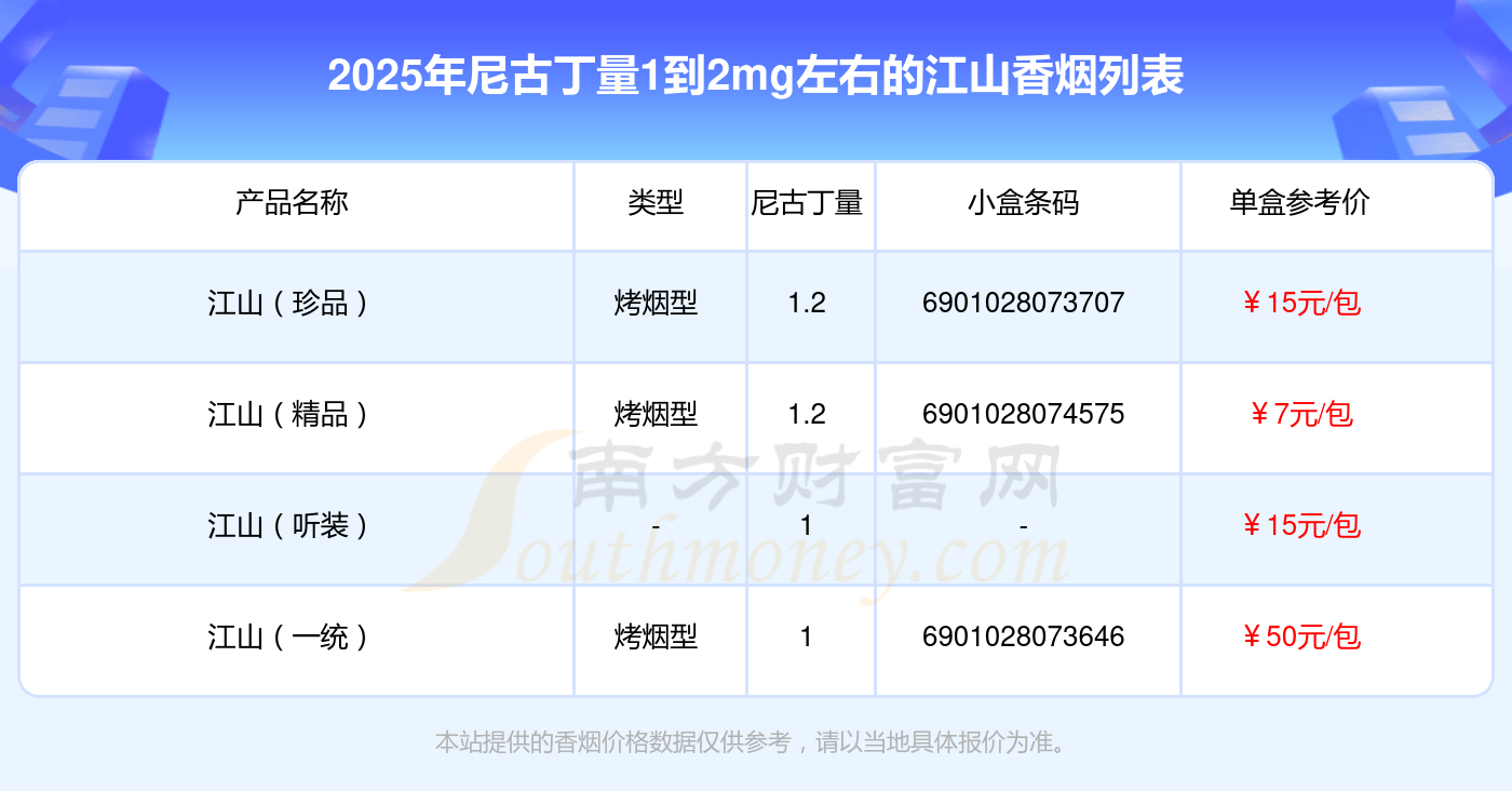 江山香煙尼古丁量1到2mg左右的煙有江山(珍品)、江山(精品)、江山(聽裝)、江山(一統(tǒng))等,具體價格如下: