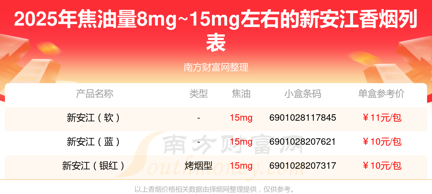 新安江香煙焦油量8mg~15mg左右的煙分別有新安江(軟)參考價11元/包、新安江(藍)參考價10元/包、新安江(銀紅)參考價10元/包等。