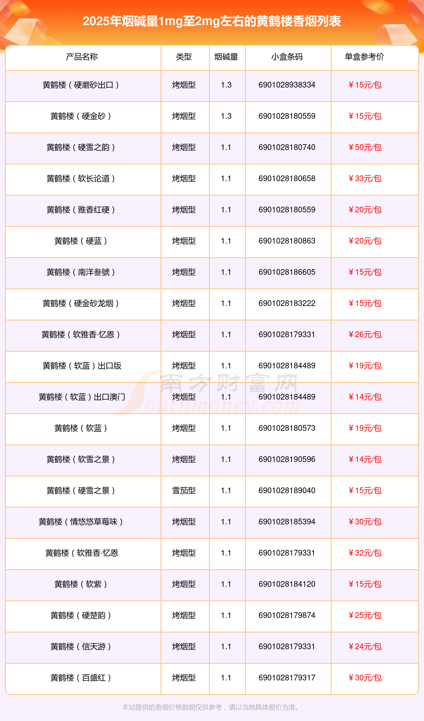 煙堿量1mg至2mg左右的黃鶴樓香煙有哪些?擇煙網(wǎng)為大家整理盤(pán)點(diǎn),有黃鶴樓(硬磨砂出口)、黃鶴樓(硬金砂)、黃鶴樓(硬雪之韻)、黃鶴樓(軟長(zhǎng)論道)、黃鶴樓(雅香紅硬)、黃鶴樓(硬藍(lán))、黃鶴樓(南洋叁號(hào))、黃鶴樓(硬金砂龍煙)、黃鶴樓(軟雅香·憶恩)、黃鶴樓(軟藍(lán))出口版等,詳細(xì)價(jià)格如下: