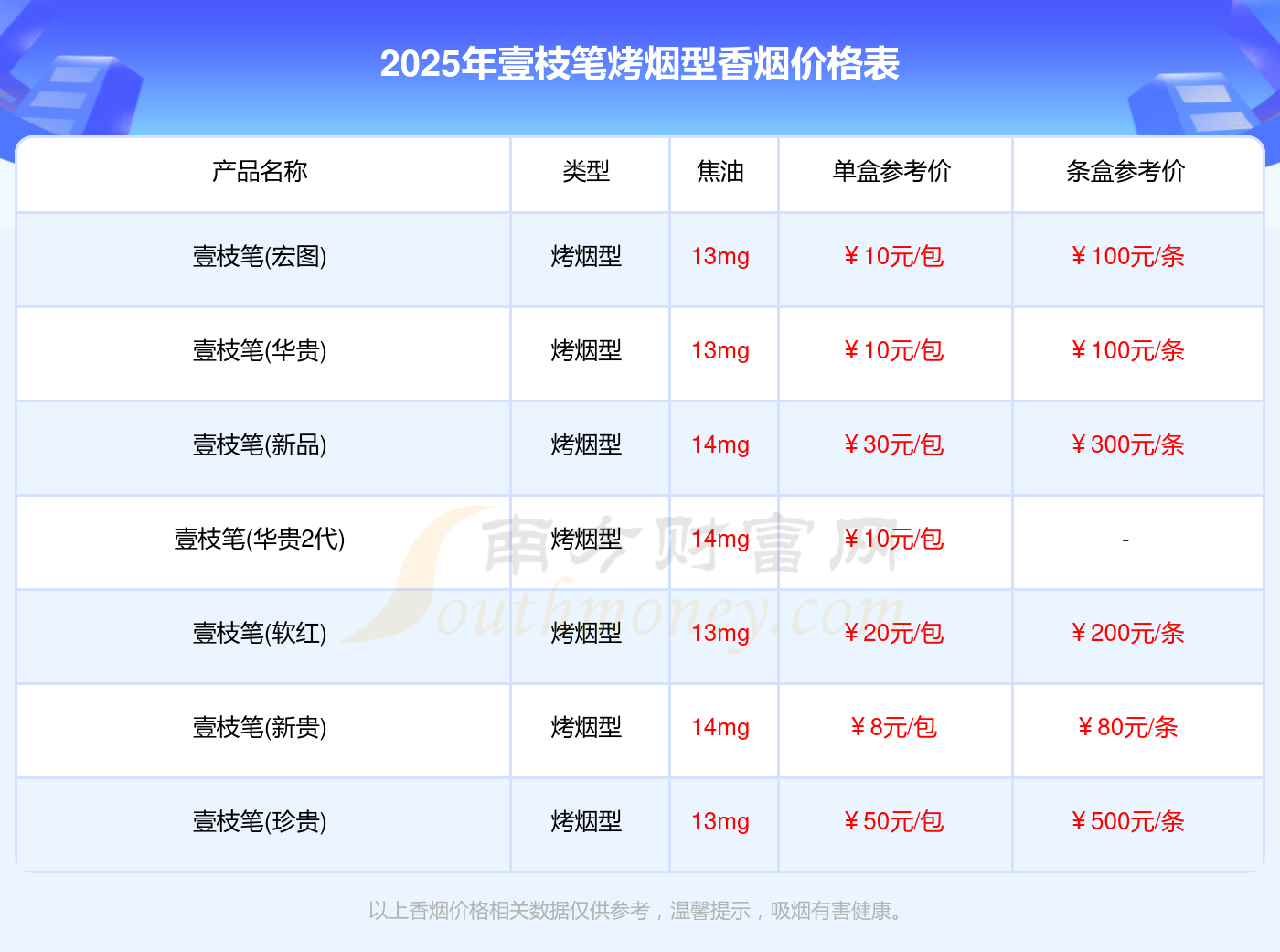 當下壹枝筆價格最高的烤煙型香煙為壹枝筆(珍貴),參考價50.0元/包,而壹枝筆香煙價格最低的是壹枝筆(新貴),參考價8.0元/包,價格高低差為42元/包。