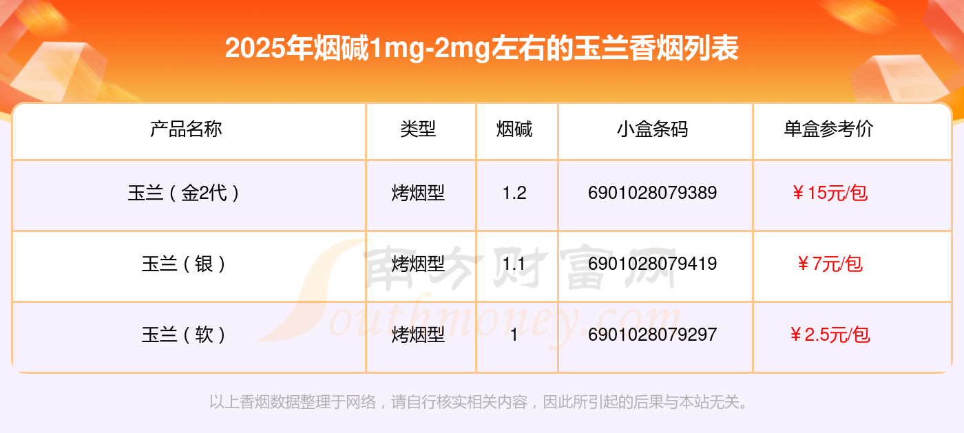 玉蘭香煙煙堿1mg-2mg左右的煙有玉蘭(金2代)、玉蘭(銀)、玉蘭(軟)等,詳細(xì)價(jià)格如下: