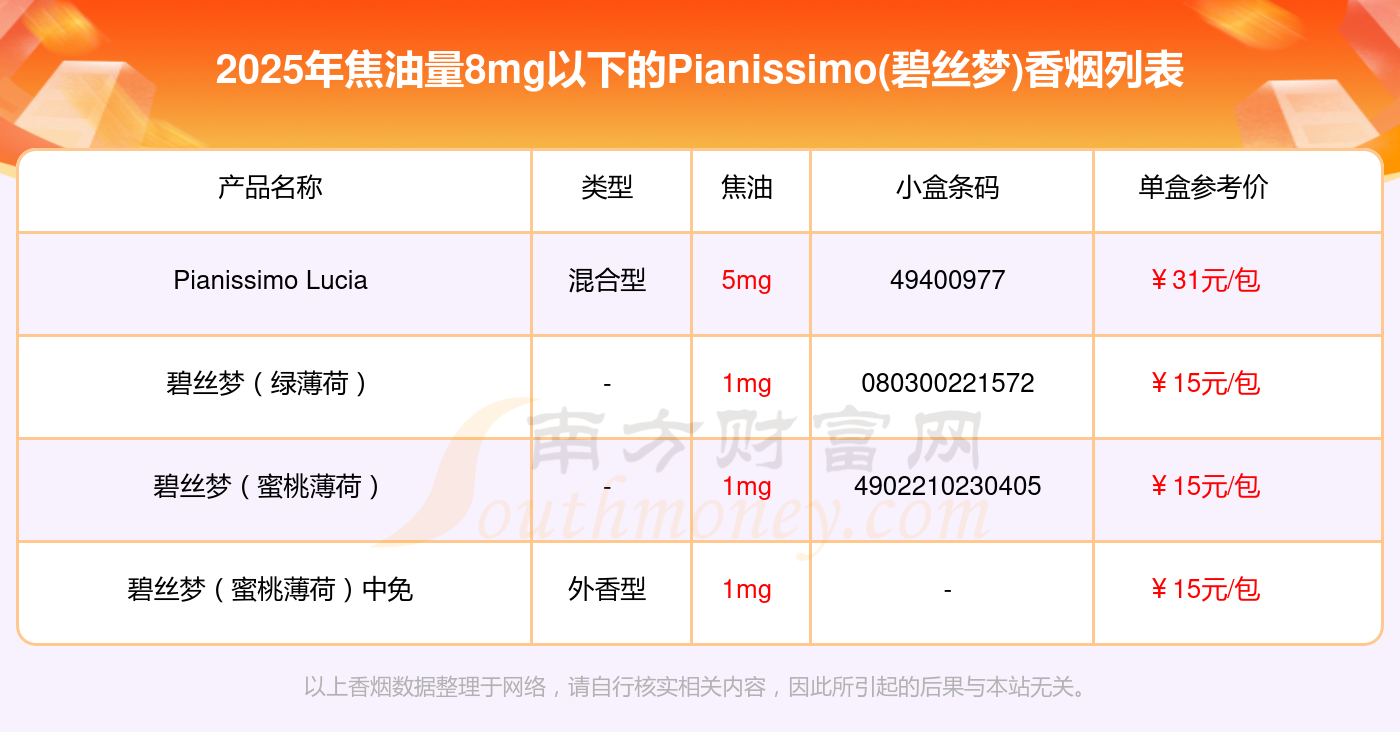 焦油量8mg以下的Pianissimo(碧絲夢)香煙有哪些?擇煙網(wǎng)為大家整理盤點(diǎn),分別有: