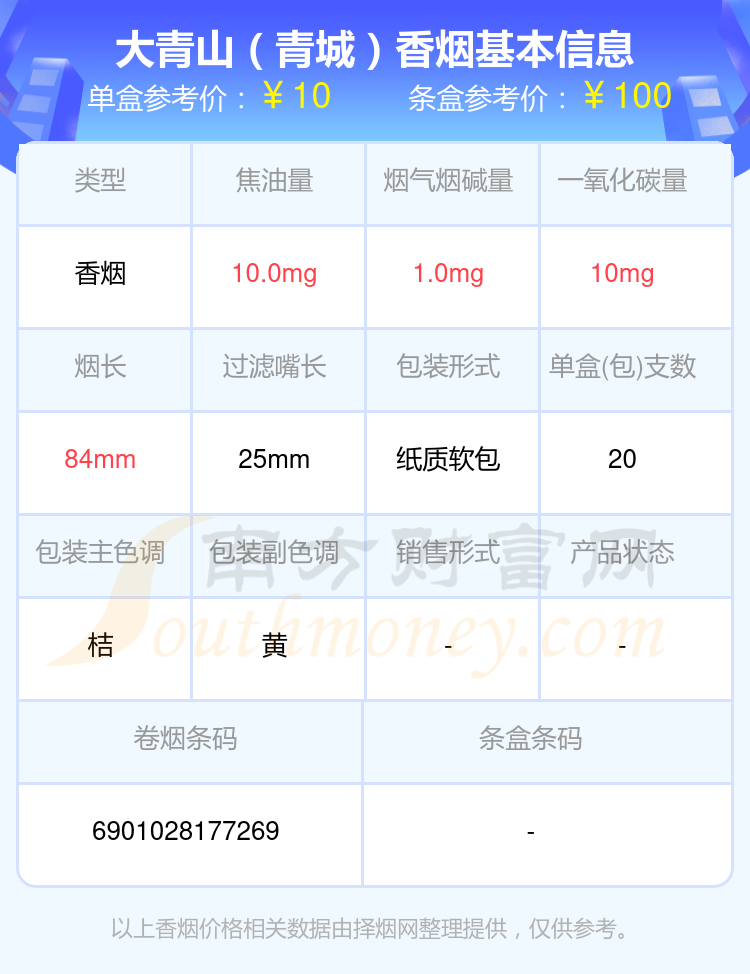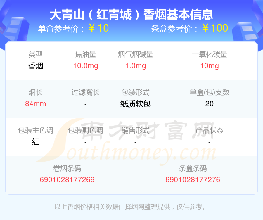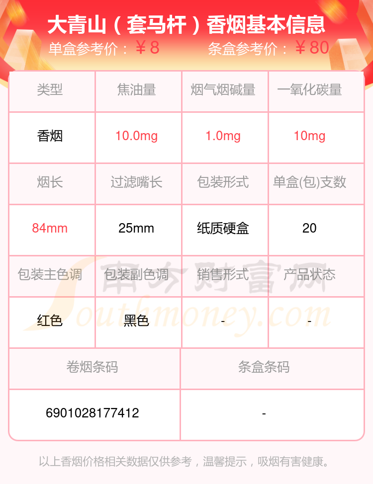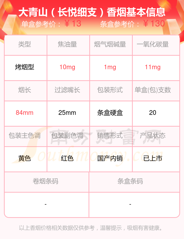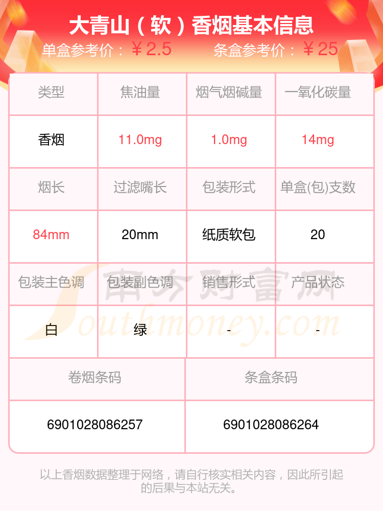 大青山香煙尼古丁低于5mg的煙有哪些?擇煙網(wǎng)為大家整理提供,分別有:大青山(紅青城)、大青山(青城)、大青山(軟)、大青山(套馬桿)、大青山(長(zhǎng)悅)、大青山(長(zhǎng)豐)、大青山(長(zhǎng)豐中支)、大青山(長(zhǎng)悅細(xì)支)、大青山(長(zhǎng)豐)中支、大青山(狼圖騰)等,具體價(jià)格如下: