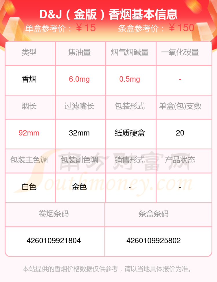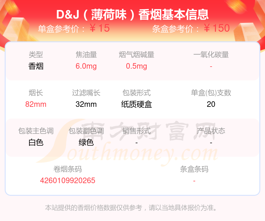 D&J(薄荷味)參考價15.0元/包、D&J(金版)參考價15.0元/包等。
