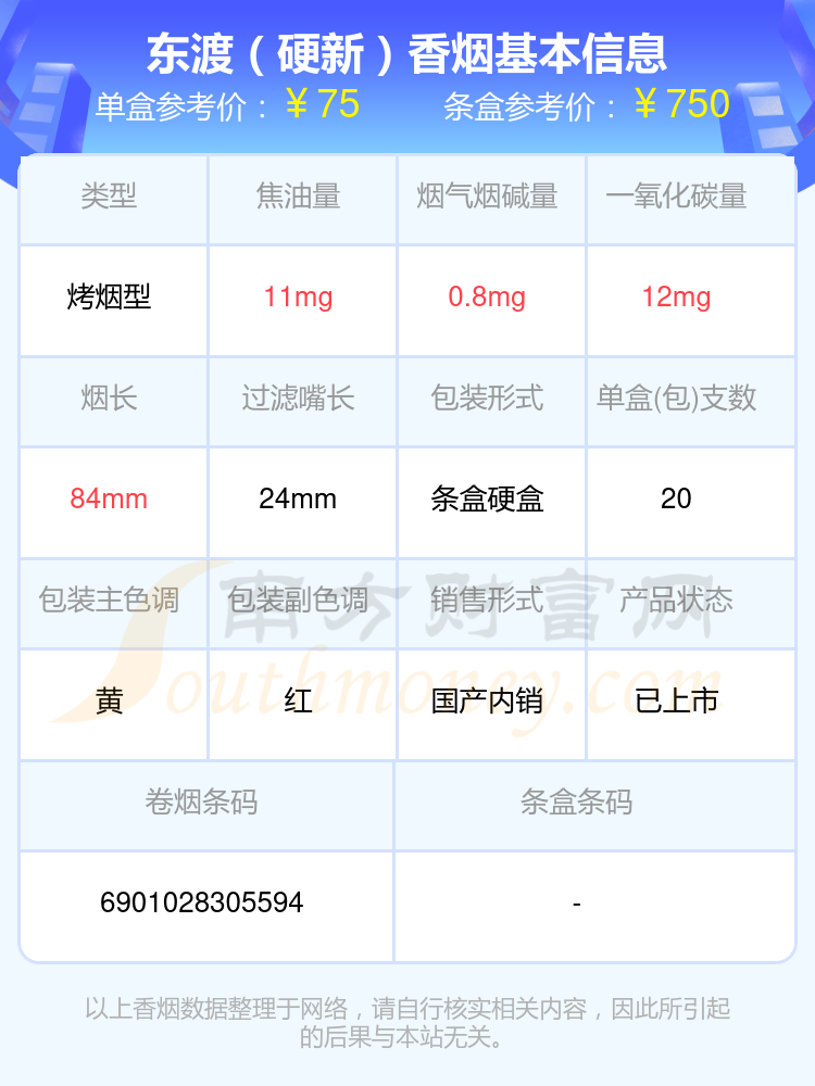 東渡香煙尼古丁量1.5mg以下的煙分別有東渡(硬藍(lán))參考價(jià)16元/包、東渡(硬新)參考價(jià)75元/包等。