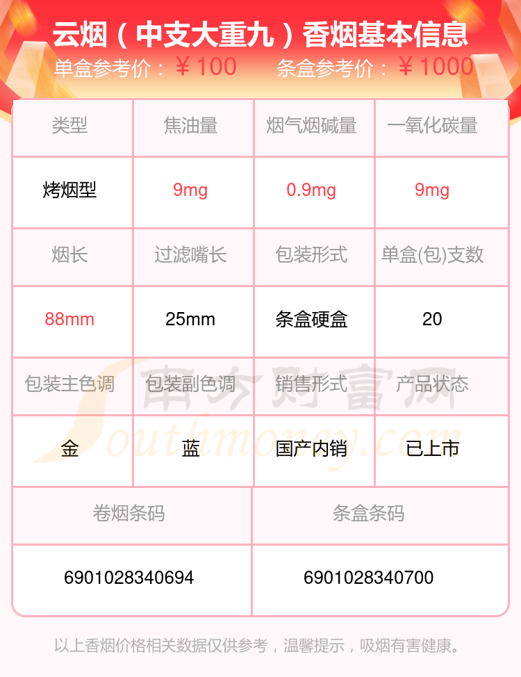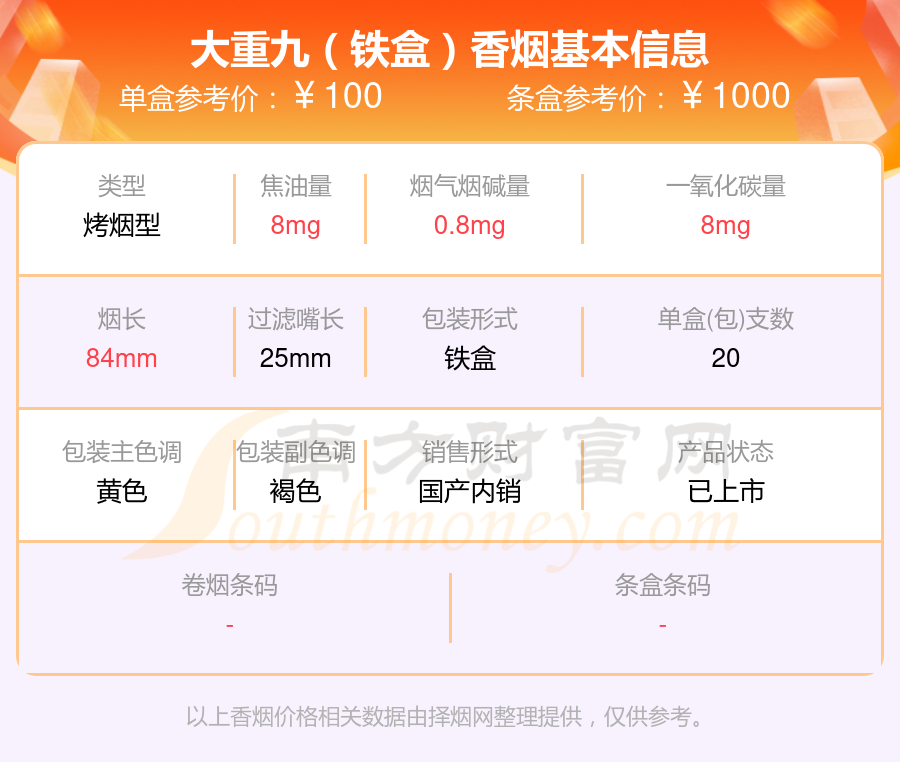 擇煙網為大家盤點了尼古丁量低于1mg的大重九香煙,分別有云煙(中支大重九)、大重九(鐵盒)等,具體價格如下:
