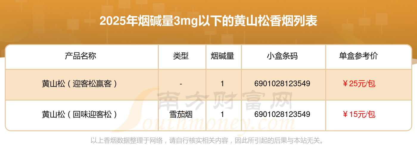 擇煙網(wǎng)為大家盤點(diǎn)了煙堿量3mg以下的黃山松香煙,有黃山松(迎客松贏客)、黃山松(回味迎客松)等,詳細(xì)價格如下: