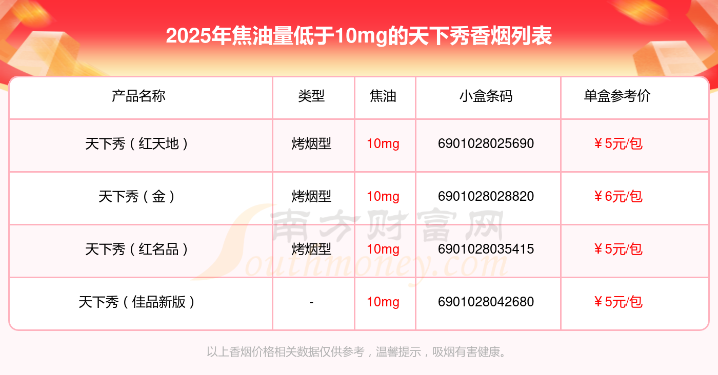 焦油量低于10mg的天下秀香煙有哪些?擇煙網(wǎng)為大家整理盤點(diǎn),分別有:天下秀(紅天地)、天下秀(金)、天下秀(紅名品)、天下秀(佳品新版)等,具體價(jià)格如下: