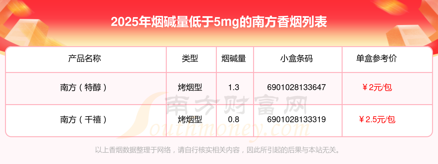 南方香煙煙堿量低于5mg的煙有哪些?擇煙網為大家整理提供,分別有:南方(特醇)、南方(千禧)等,具體價格如下: