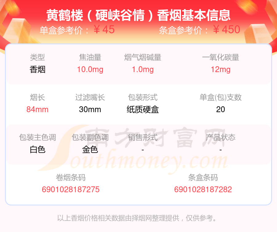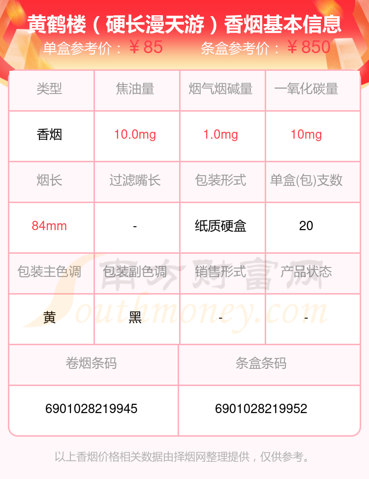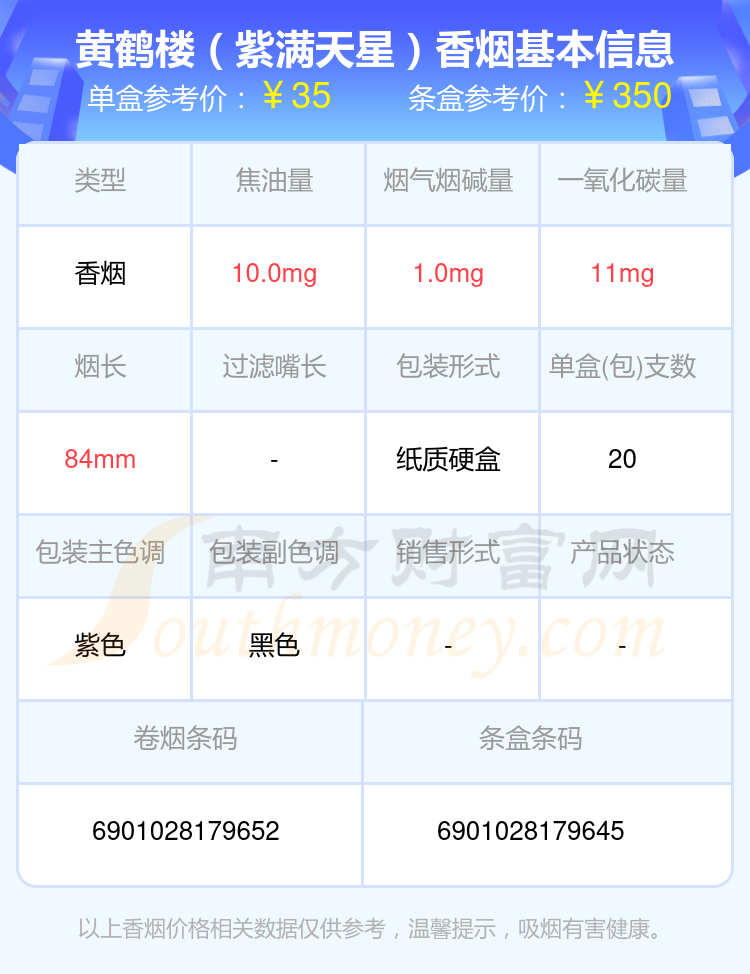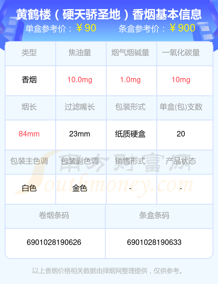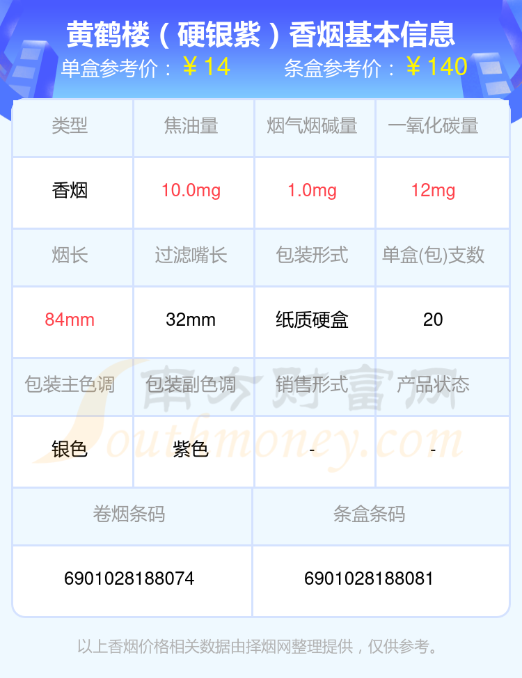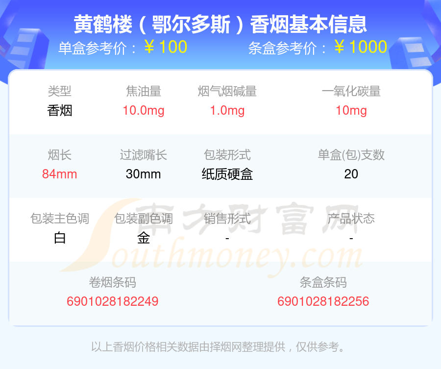 煙堿1mg以下的黃鶴樓香煙有哪些?擇煙網(wǎng)為大家整理盤點(diǎn),有黃鶴樓(包頭)、黃鶴樓(軟正道)、黃鶴樓(硬長(zhǎng)漫天游)、黃鶴樓(硬峽谷情)、黃鶴樓(硬天驕?zhǔn)サ兀、黃鶴樓(金樓)、黃鶴樓(硬銀紫)、黃鶴樓(硬全家福)、黃鶴樓(紫滿天星)、黃鶴樓(鄂爾多斯)等,詳細(xì)價(jià)格如下: