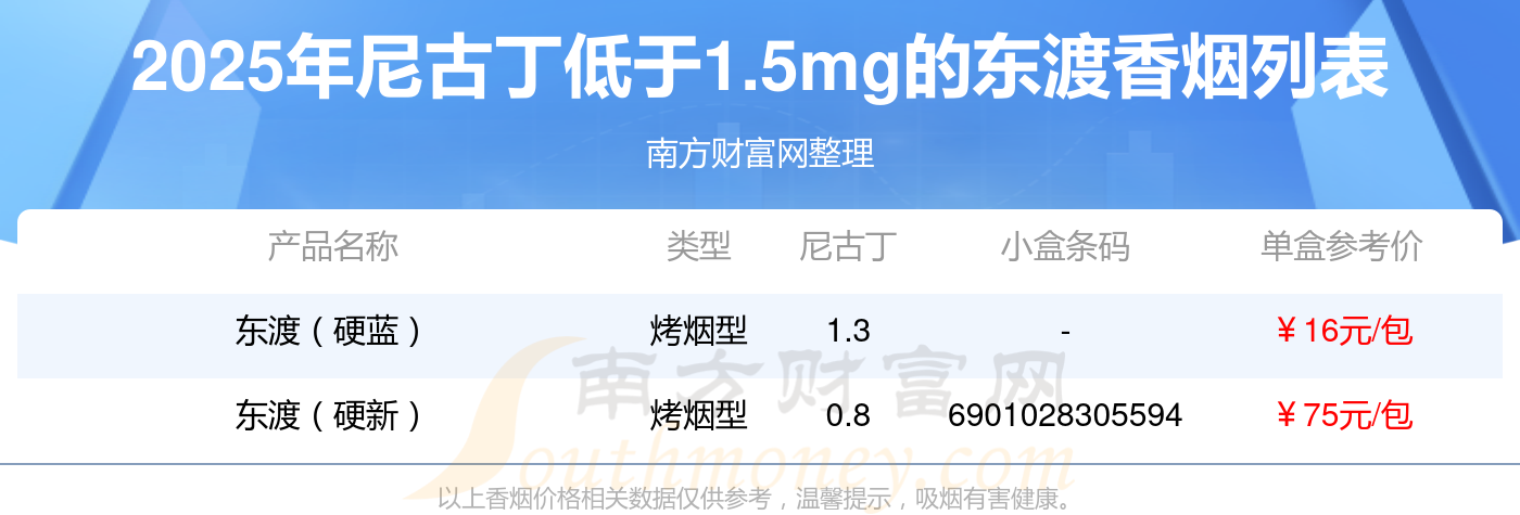 東渡香煙尼古丁低于1.5mg的煙分別有東渡(硬藍(lán))參考價(jià)16元/包、東渡(硬新)參考價(jià)75元/包等。