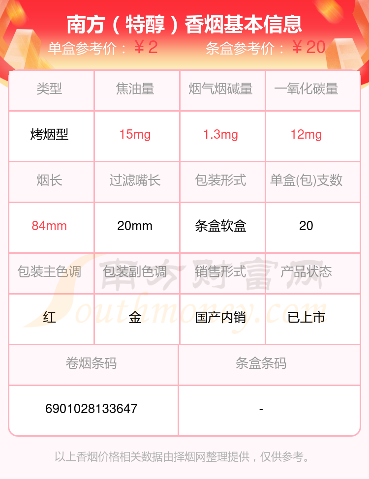 擇煙網(wǎng)為大家盤點了南方香煙焦油量8-15mg左右的,分別有南方(特醇)、南方(千禧)等,詳細價格如下: