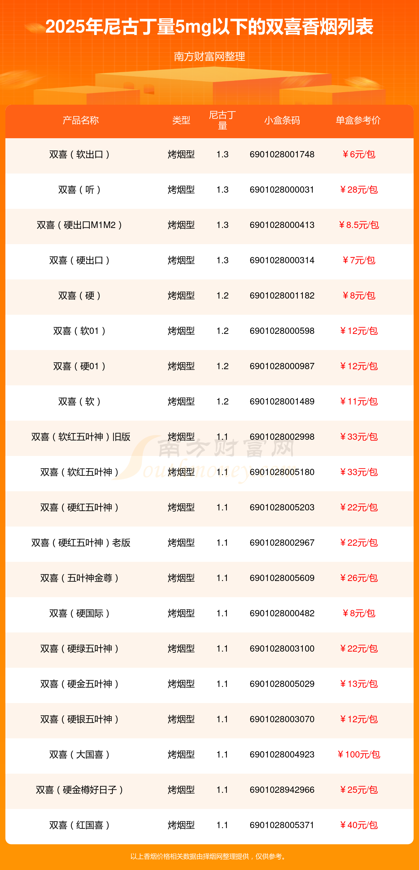 擇煙網(wǎng)為大家盤點了尼古丁量5mg以下的雙喜香煙,分別有雙喜(軟出口)、雙喜(聽)、雙喜(硬出口M1M2)、雙喜(硬出口)、雙喜(硬)、雙喜(軟01)、雙喜(硬01)、雙喜(軟)、雙喜(軟紅五葉神)舊版、雙喜(軟紅五葉神)等,具體價格如下: