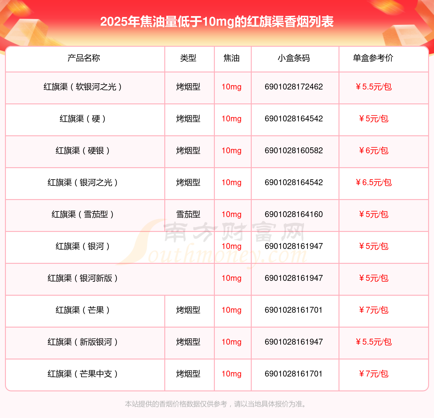 紅旗渠香煙焦油量低于10mg的煙有紅旗渠(軟銀河之光)、紅旗渠(硬)、紅旗渠(硬銀)、紅旗渠(銀河之光)、紅旗渠(雪茄型)、紅旗渠(銀河)、紅旗渠(銀河新版)、紅旗渠(芒果)、紅旗渠(新版銀河)、紅旗渠(芒果中支)等,具體價格如下: