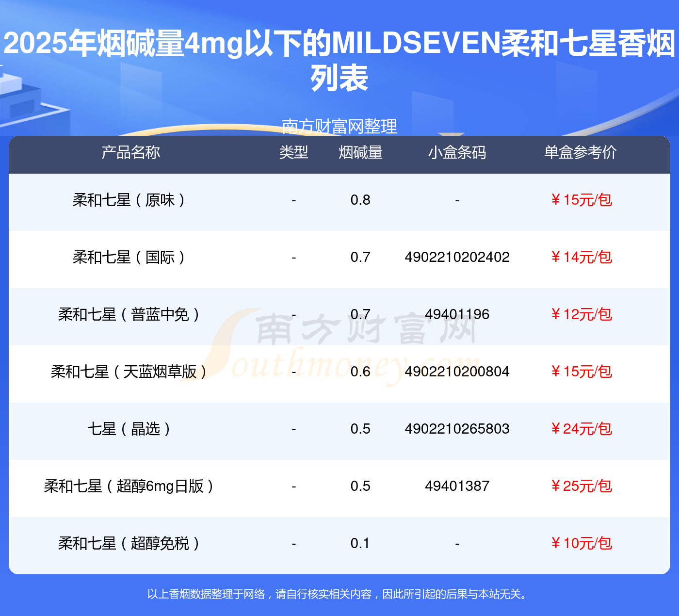 擇煙網(wǎng)為大家盤點了煙堿量4mg以下的MILDSEVEN柔和七星香煙,有柔和七星(原味)、柔和七星(國際)、柔和七星(普藍中免)、柔和七星(天藍煙草版)、七星(晶選)、柔和七星(超醇6mg日版)、柔和七星(超醇免稅)等,詳細價格如下: