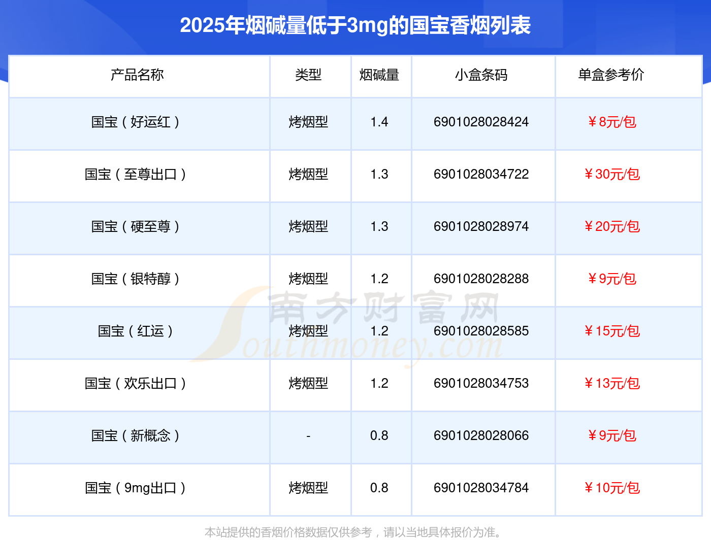 國寶(好運紅)參考價8元/包、國寶(至尊出口)參考價30.0元/包、國寶(硬至尊)參考價20元/包、國寶(銀特醇)參考價9元/包、國寶(紅運)參考價15元/包、國寶(歡樂出口)參考價13元/包、國寶(新概念)參考價9元/包、國寶(9mg出口)參考價10元/包等。