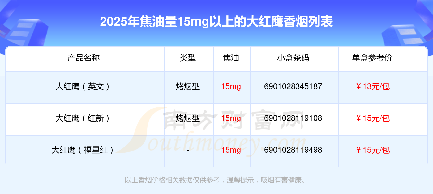 大紅鷹香煙焦油量15mg以上的煙有大紅鷹(英文)、大紅鷹(紅新)、大紅鷹(福星紅)等,詳細價格如下: