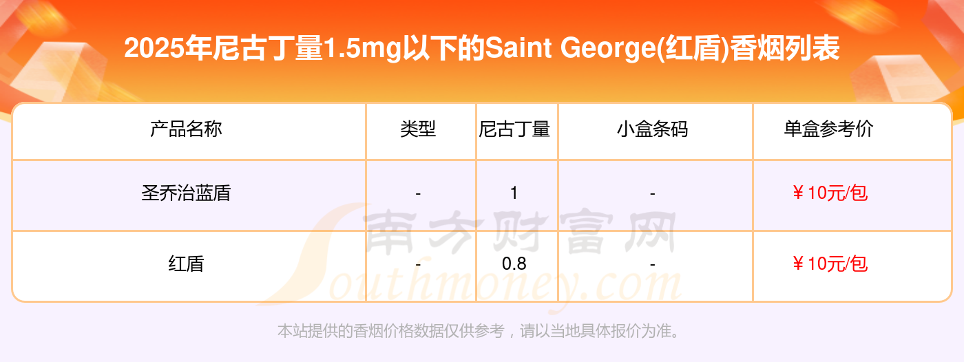 Saint George(紅盾)香煙尼古丁量1.5mg以下的煙有圣喬治藍(lán)盾、紅盾等,詳細(xì)價(jià)格如下: