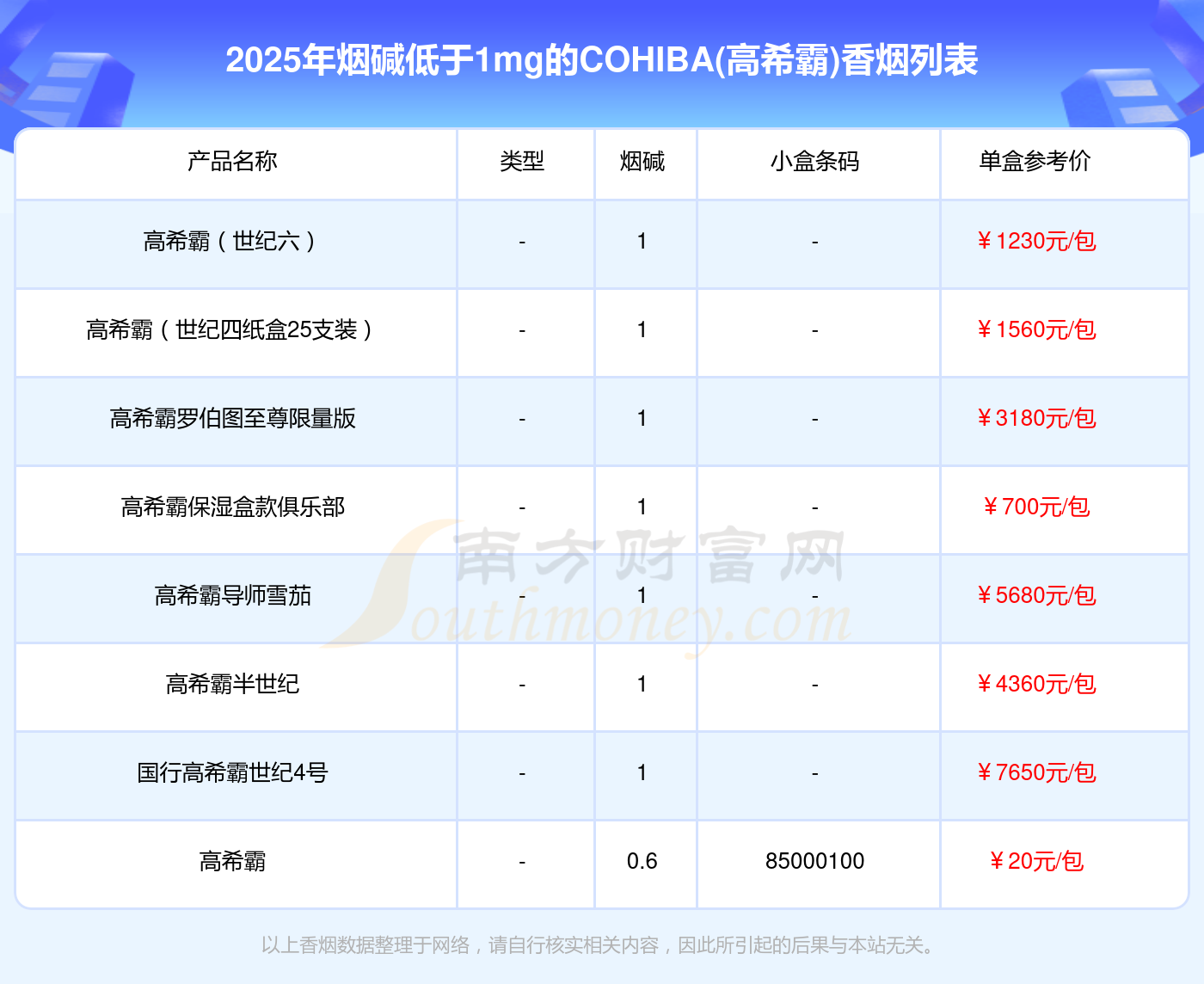 COHIBA(高希霸)香煙煙堿低于1mg的煙有高希霸(世紀(jì)六)、高希霸(世紀(jì)四紙盒25支裝)、高希霸羅伯圖至尊限量版、高希霸保濕盒款俱樂部、高希霸導(dǎo)師雪茄、高希霸半世紀(jì)、國行高希霸世紀(jì)4號、高希霸等,具體價格如下: