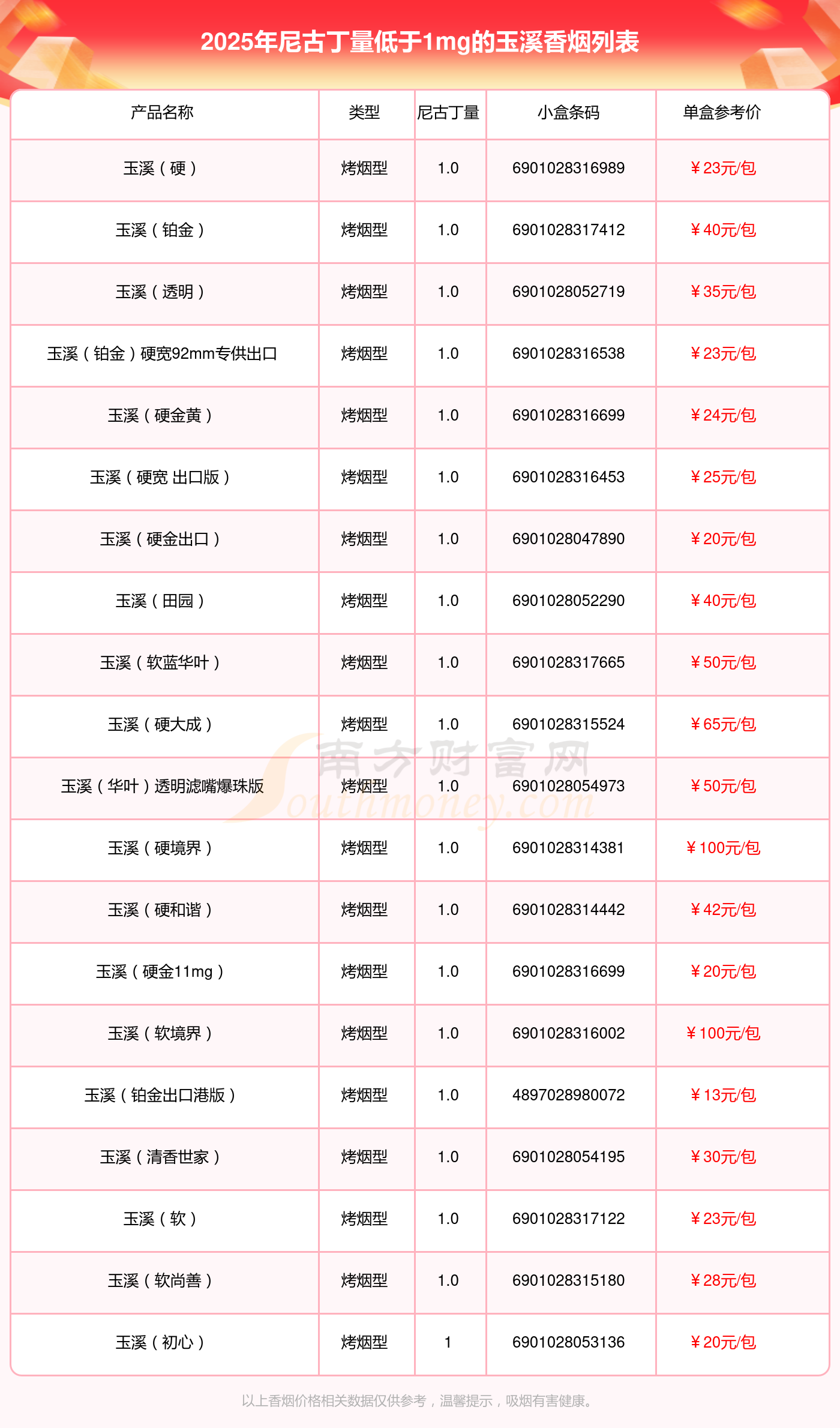 玉溪香煙尼古丁量低于1mg的煙有哪些?擇煙網(wǎng)為大家整理提供,分別有:玉溪(硬)、玉溪(鉑金)、玉溪(透明)、玉溪(鉑金)硬寬92mm專供出口、玉溪(硬金黃)、玉溪(硬寬 出口版)、玉溪(硬金出口)、玉溪(田園)、玉溪(軟藍(lán)華葉)、玉溪(硬大成)等,具體價(jià)格如下: