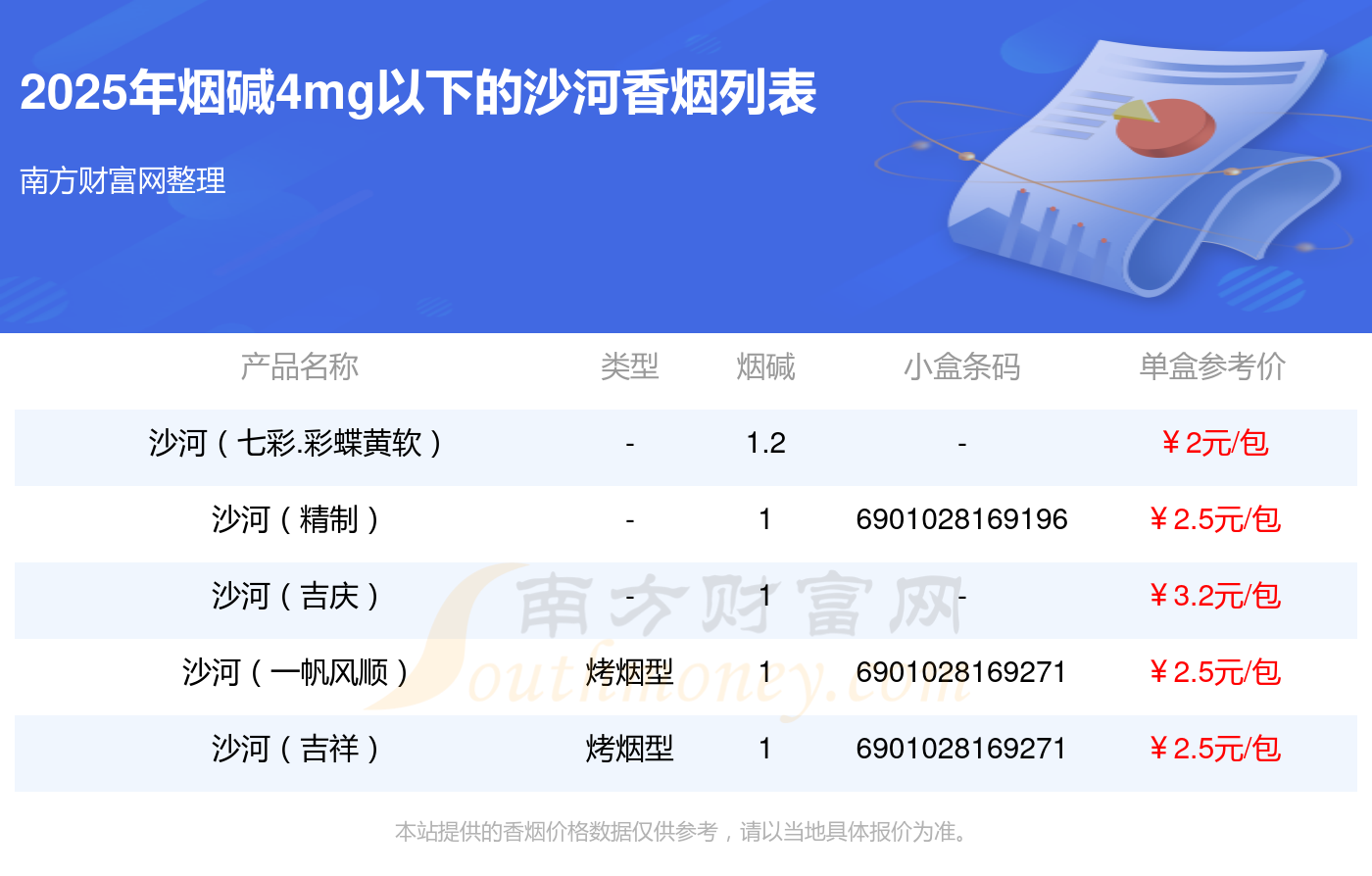 煙堿4mg以下的沙河香煙有哪些?擇煙網(wǎng)為大家整理盤點,有沙河(七彩.彩蝶黃軟)、沙河(精制)、沙河(吉慶)、沙河(一帆風(fēng)順)、沙河(吉祥)等,詳細(xì)價格如下: