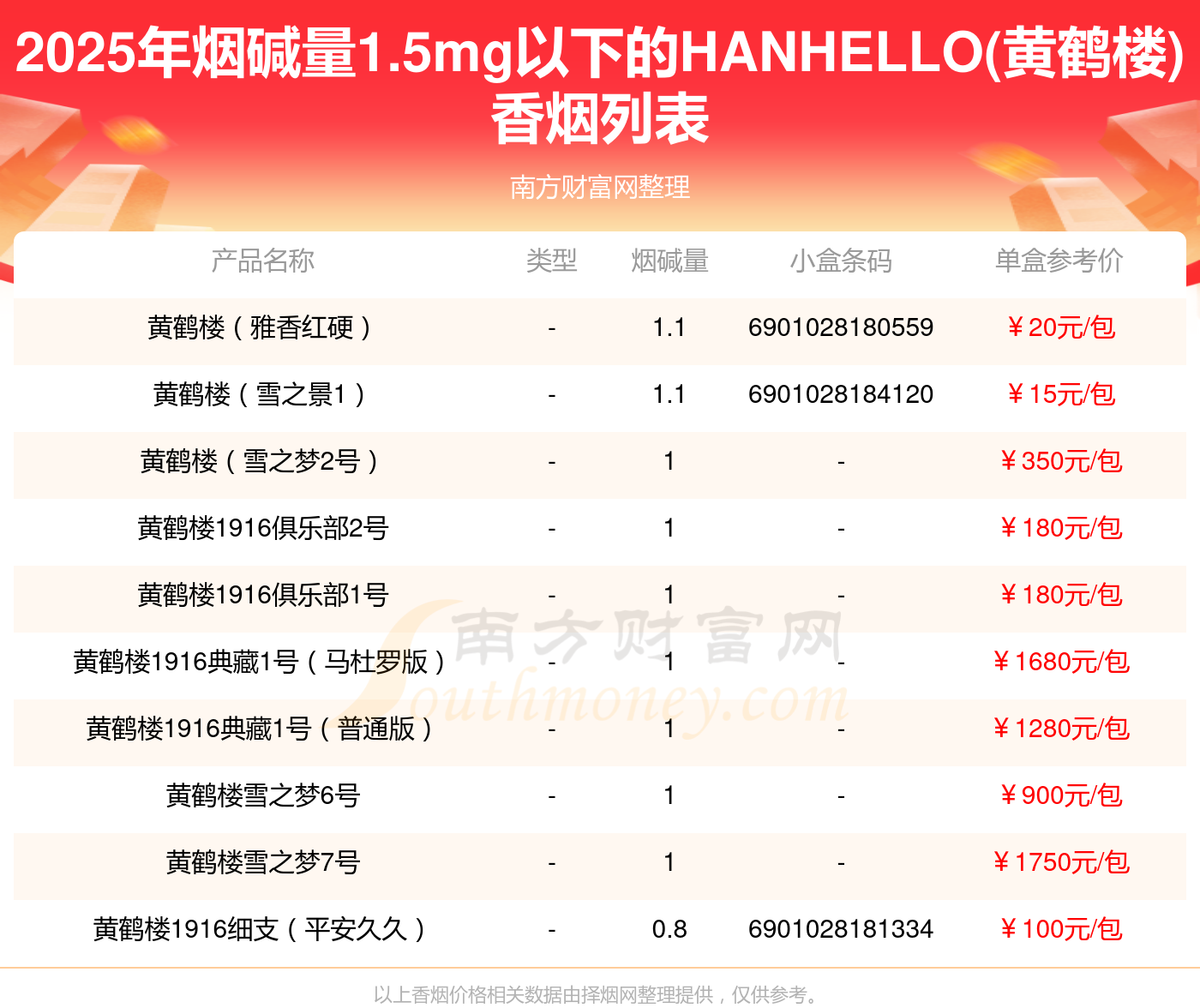擇煙網(wǎng)為大家盤(pán)點(diǎn)了煙堿量1.5mg以下的HANHELLO(黃鶴樓)香煙,分別有黃鶴樓(雅香紅硬)、黃鶴樓(雪之景1)、黃鶴樓(雪之夢(mèng)2號(hào))、黃鶴樓1916俱樂(lè)部2號(hào)、黃鶴樓1916俱樂(lè)部1號(hào)、黃鶴樓1916典藏1號(hào)(馬杜羅版)、黃鶴樓1916典藏1號(hào)(普通版)、黃鶴樓雪之夢(mèng)6號(hào)、黃鶴樓雪之夢(mèng)7號(hào)、黃鶴樓1916細(xì)支(平安久久)等,具體價(jià)格如下: