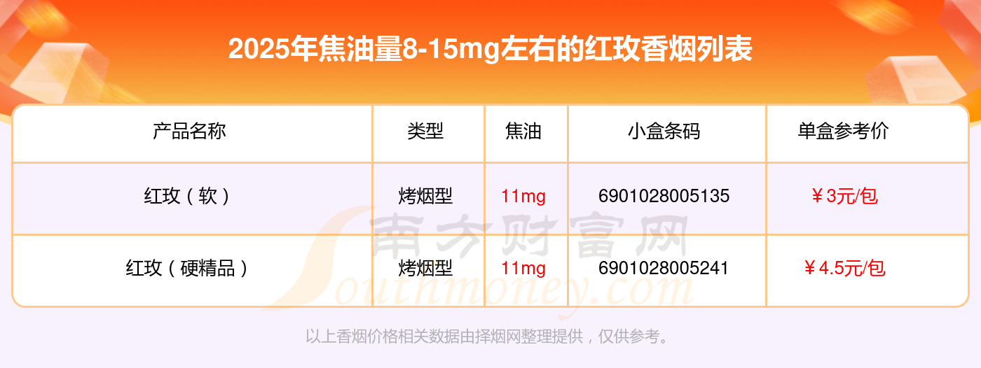 焦油量8-15mg左右的紅玫香煙有哪些?擇煙網(wǎng)為大家整理盤點,有紅玫(軟)、紅玫(硬精品)等,詳細價格如下: