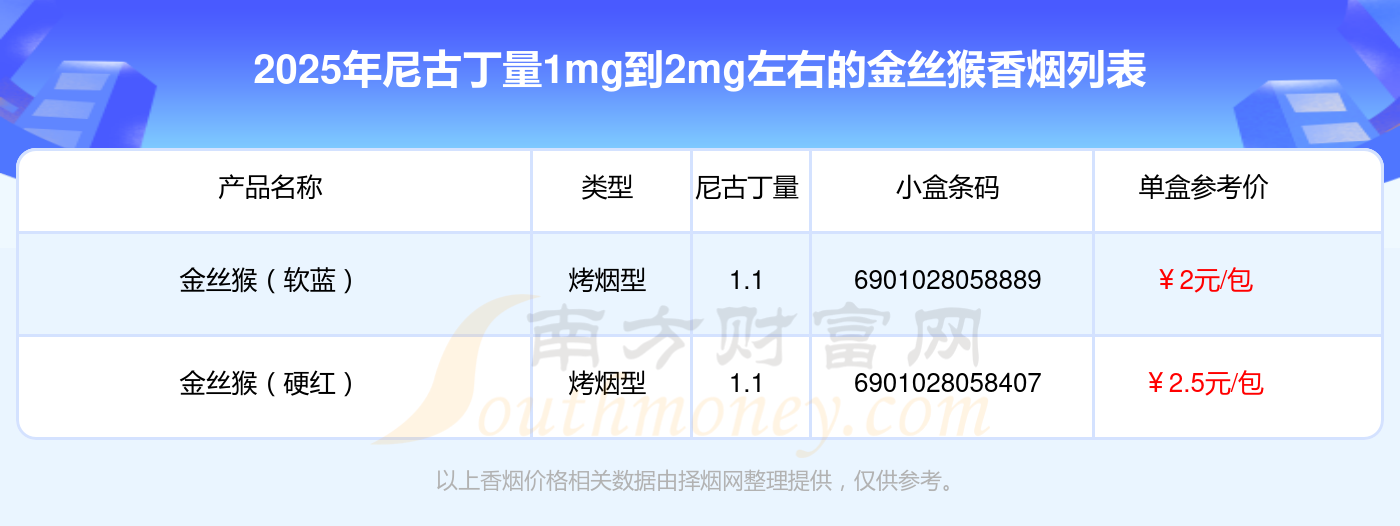 擇煙網(wǎng)為大家盤點了金絲猴香煙尼古丁量1mg到2mg左右的,分別有金絲猴(軟藍(lán))、金絲猴(硬紅)等,具體價格如下: