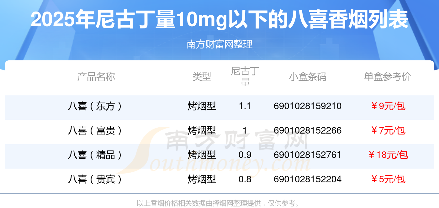 八喜香煙尼古丁量10mg以下的煙分別有八喜(東方)參考價(jià)9元/包、八喜(富貴)參考價(jià)7元/包、八喜(精品)參考價(jià)18元/包、八喜(貴賓)參考價(jià)5元/包等。