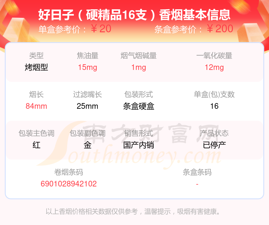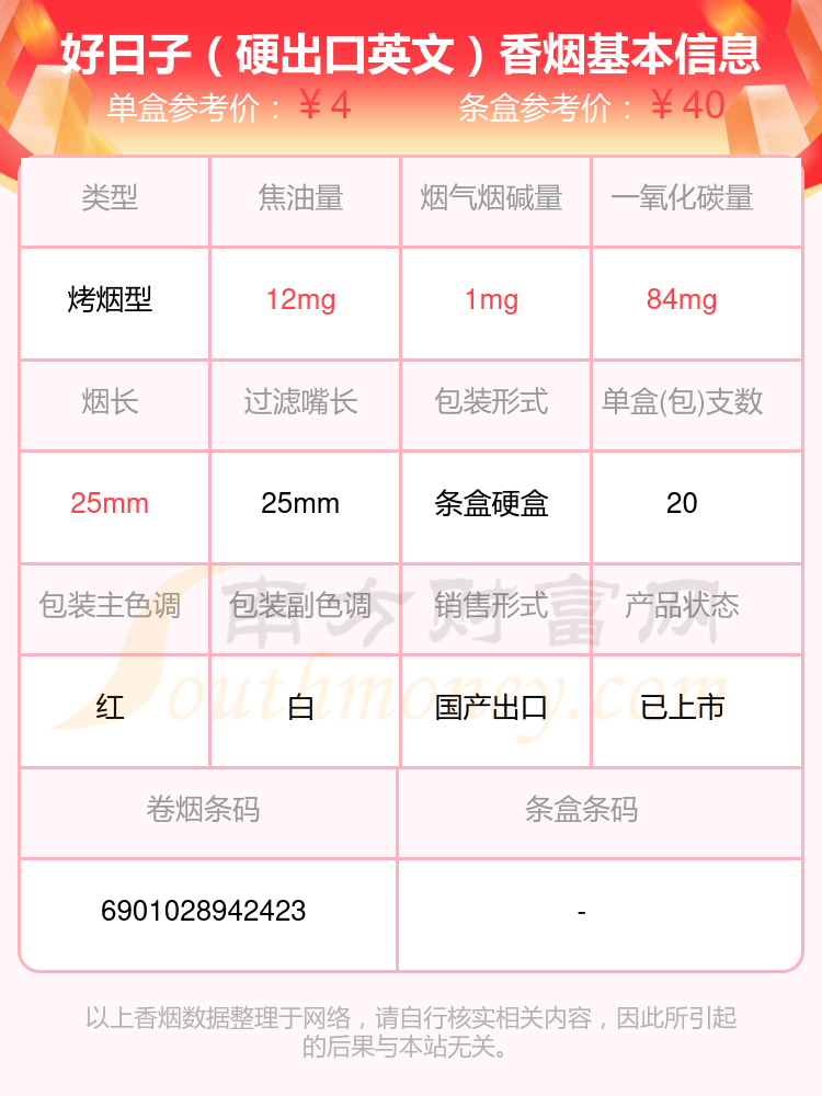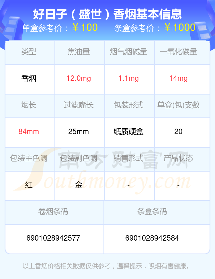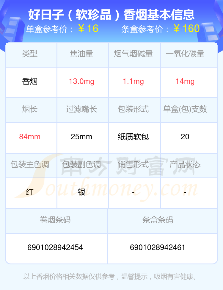 好日子香煙煙堿1到2mg的煙有哪些?擇煙網(wǎng)為大家整理提供,分別有:好日子(硬金尊)、好日子(硬金精品)、好日子(軟珍品)、好日子(硬吉祥)、好日子(盛世)、好日子(硬)、好日子(軟)、好日子(硬精品16支)、好日子(硬出口英文)、好日子(軟如意)等,具體價格如下: