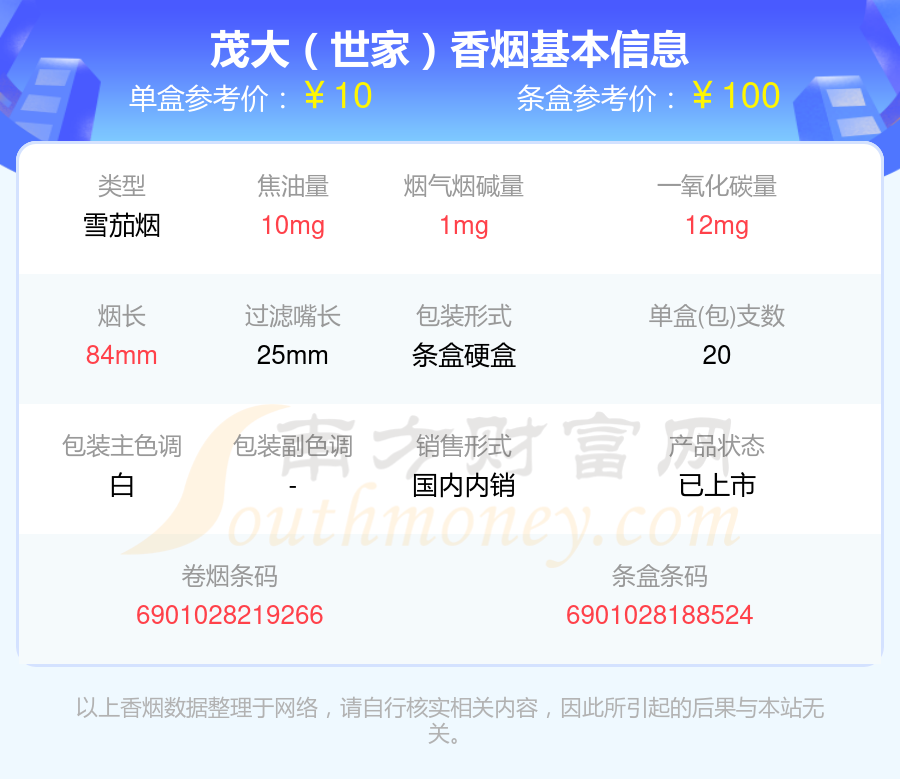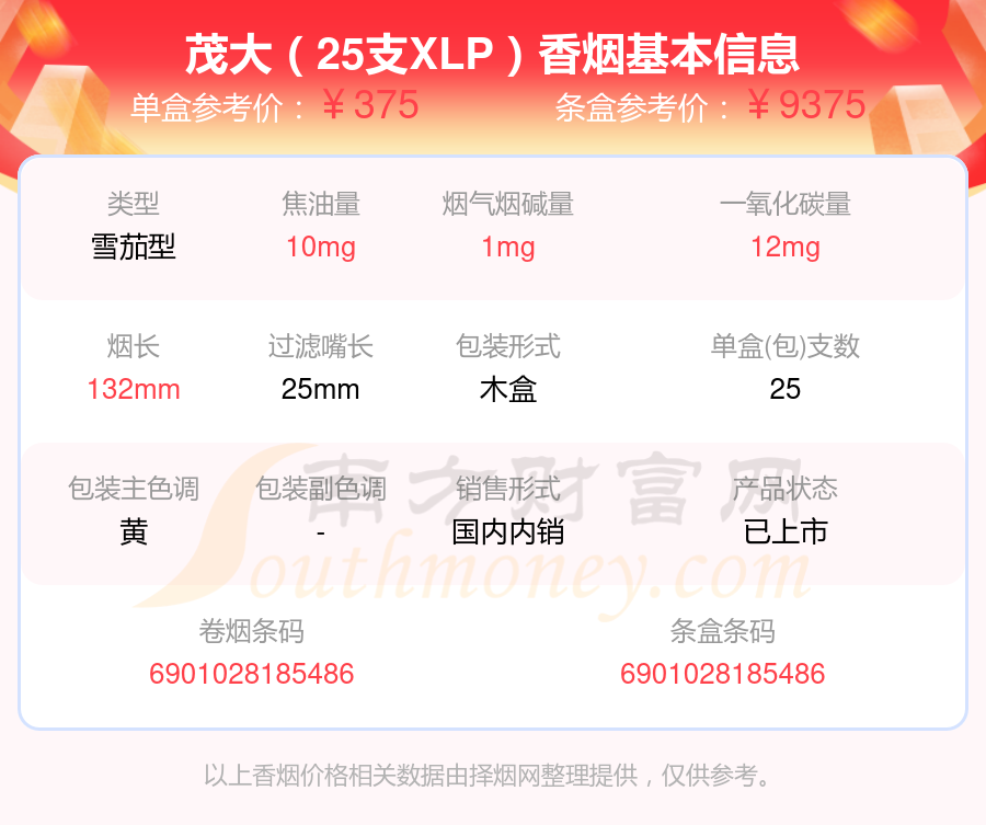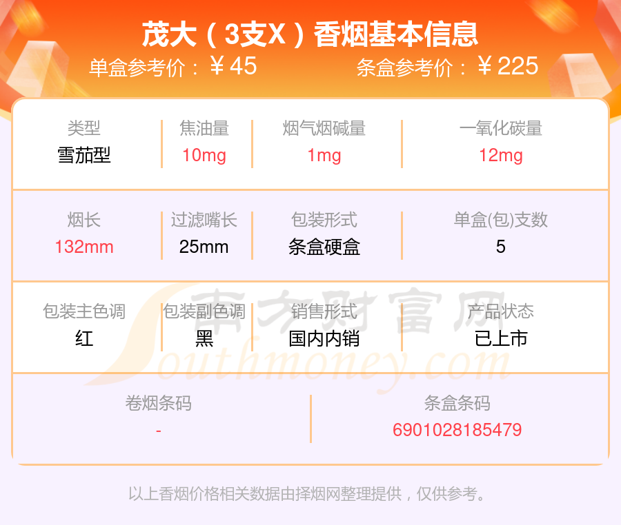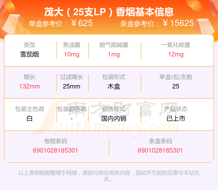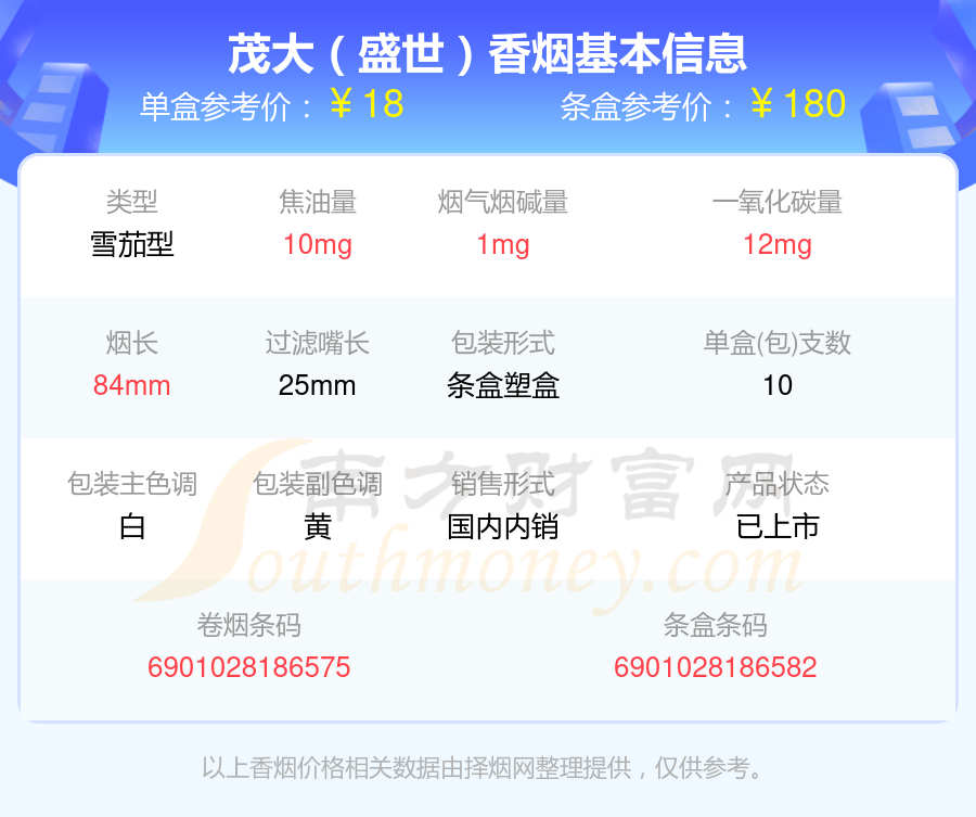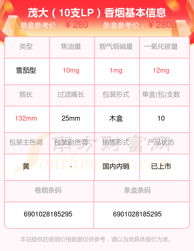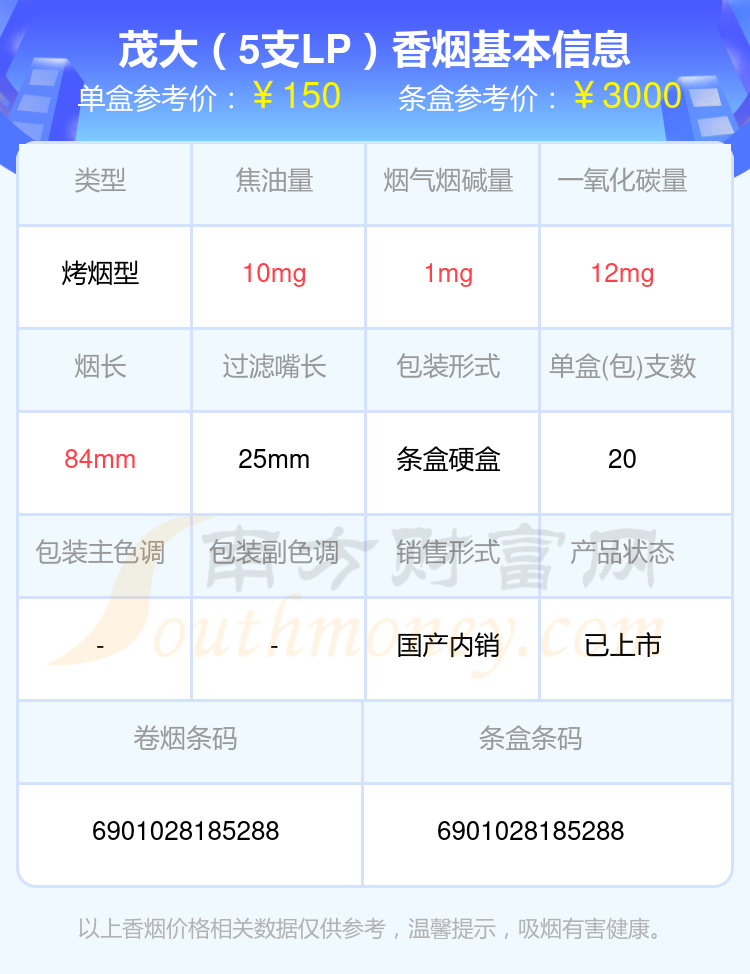 茂大香煙煙堿量低于1mg的煙有茂大(5支LP)、茂大(10支LP)、茂大(25支XLP)、茂大(25支LP)、茂大(2號)、茂大(3支X)、茂大(世家)、茂大(盛世)等,詳細(xì)價格如下: