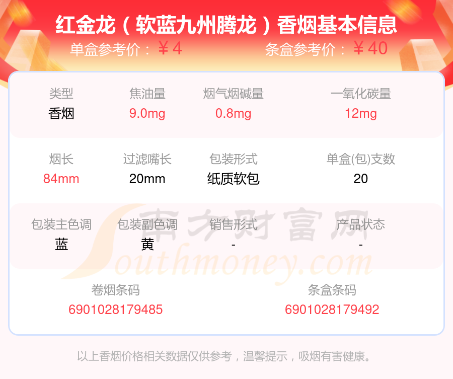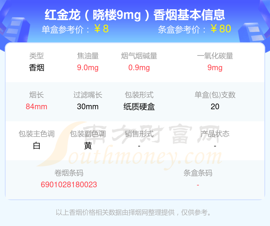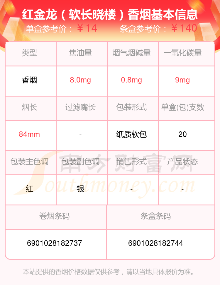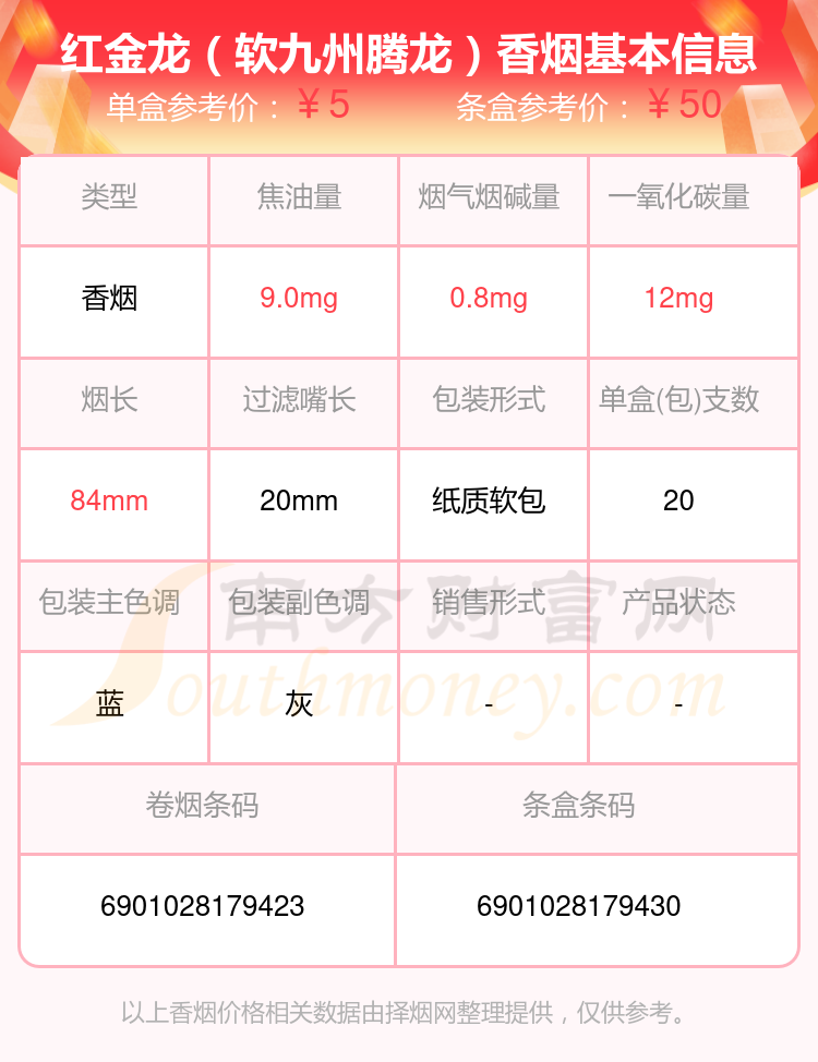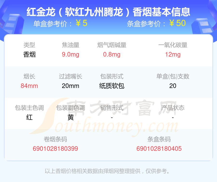 擇煙網(wǎng)為大家盤點了焦油量10mg以下的紅金龍香煙,分別有紅金龍(曉樓9mg)、紅金龍(軟紅九州騰龍)、紅金龍(軟九州騰龍)、紅金龍(軟藍(lán)九州騰龍)、紅金龍(硬九州騰龍)、紅金龍(硬紅)、紅金龍(襄陽)、紅金龍(軟長曉樓)、紅金龍(軟紅)、紅金龍(硬南洋大樓)等,具體價格如下: