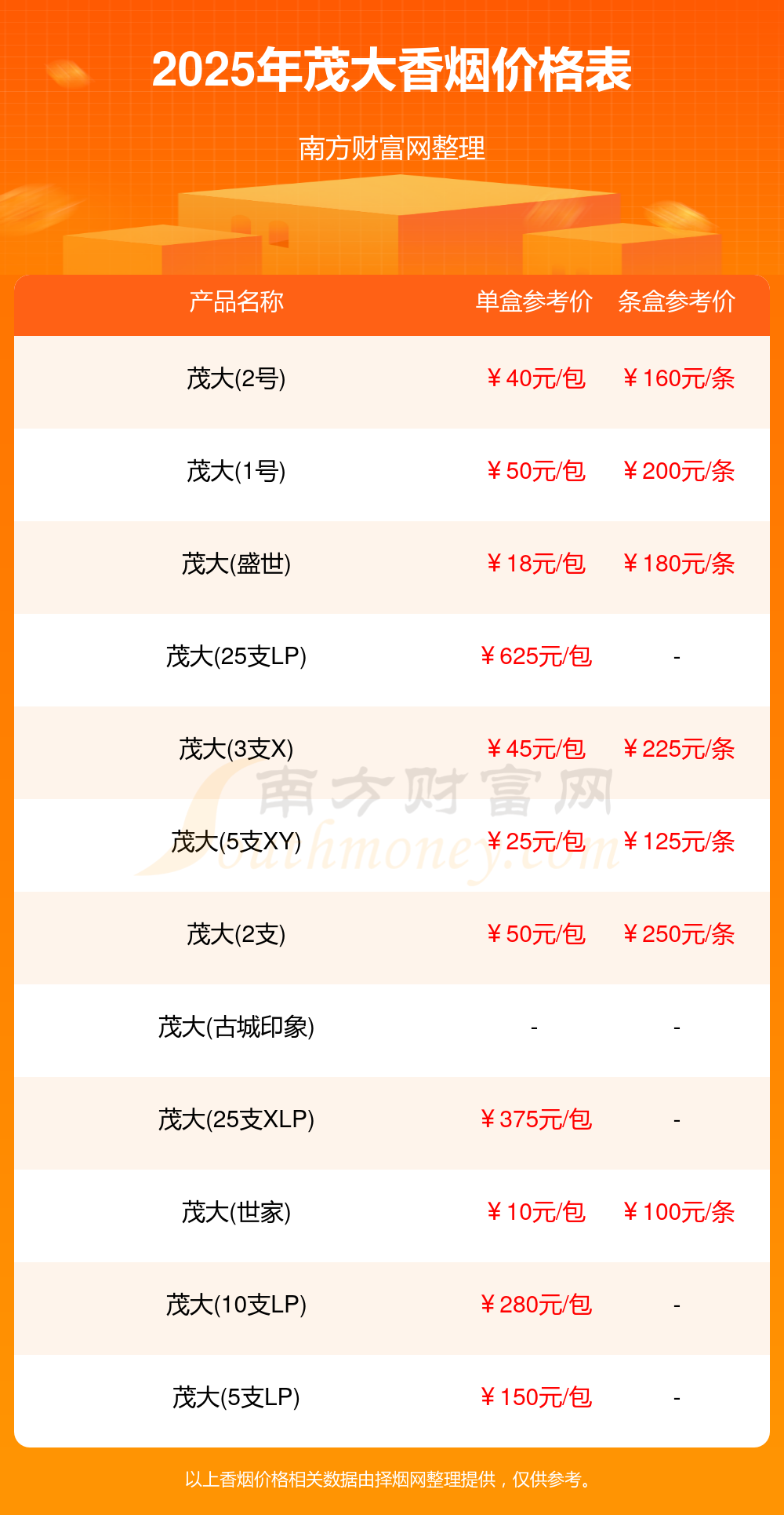 2025年茂大香煙茂大(25支LP)、茂大(25支XLP)、茂大(10支LP)、茂大(5支LP)等最新價格如下:茂大(25支LP)參考價625.0元/包、茂大(25支XLP)參考價375.0元/包、茂大(10支LP)參考價280.0元/包、茂大(5支LP)參考價150.0元/包。
