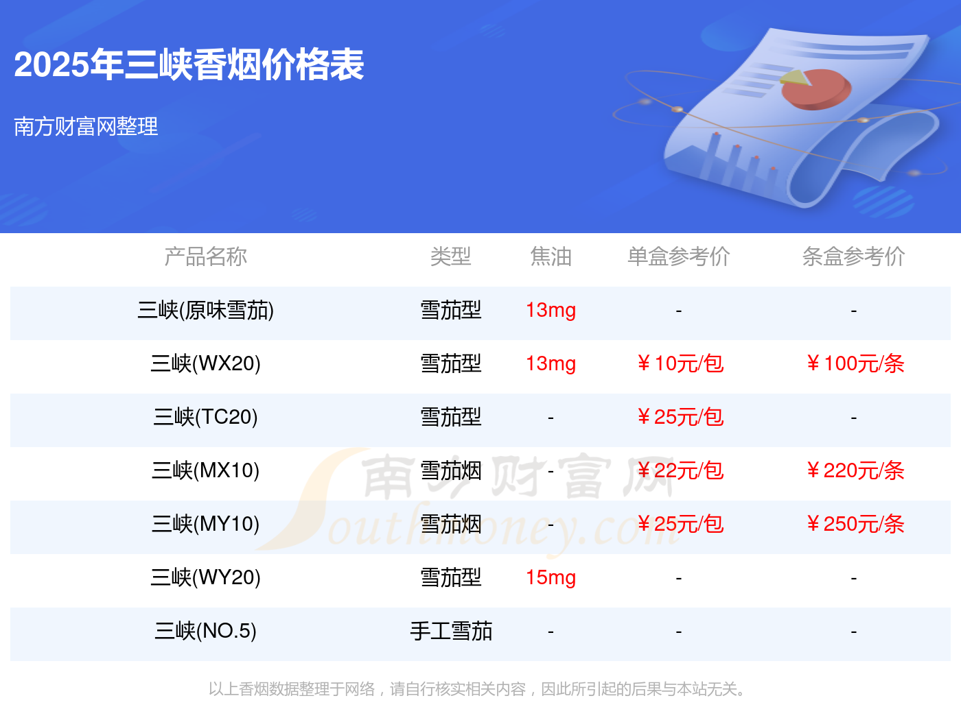 2025年,三峽(TC20)、三峽(MY10)、三峽(MX10)、三峽(WX20)等三峽香煙價格如下:三峽(TC20)參考價25.0元/包、三峽(MY10)參考價25.0元/包、三峽(MX10)參考價22.0元/包、三峽(WX20)參考價10.0元/包。