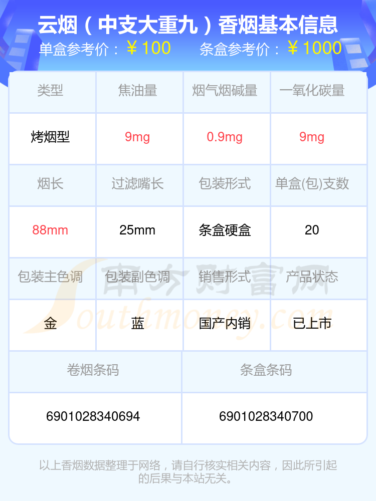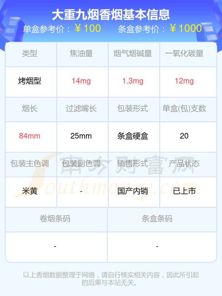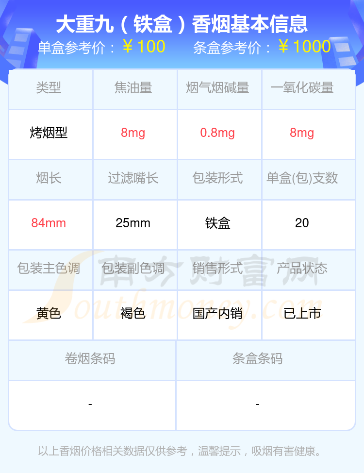 大重九香煙超過80元的煙有大重九(鐵盒)、大重九煙、云煙(中支大重九)等,詳細(xì)價格如下: