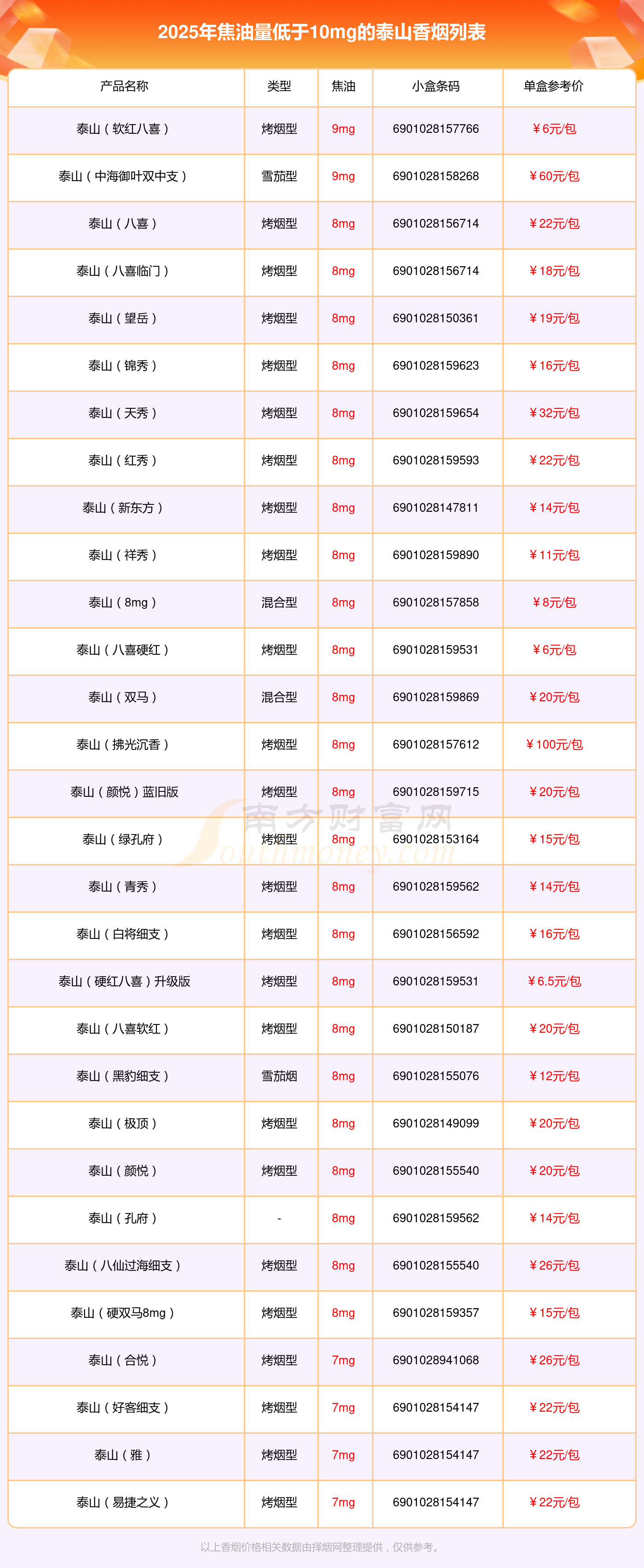焦油量低于10mg的泰山香煙有哪些?擇煙網(wǎng)為大家整理盤點(diǎn),有泰山(軟紅八喜)、泰山(中海御葉雙中支)、泰山(八喜)、泰山(八喜臨門)、泰山(望岳)、泰山(錦秀)、泰山(天秀)、泰山(紅秀)、泰山(新東方)、泰山(祥秀)等,詳細(xì)價(jià)格如下:
