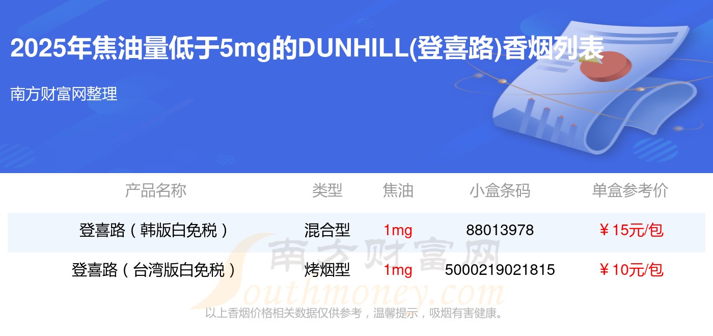 DUNHILL(登喜路)香煙焦油量低于5mg的有哪些?擇煙網(wǎng)為大家整理提供,分別有:
