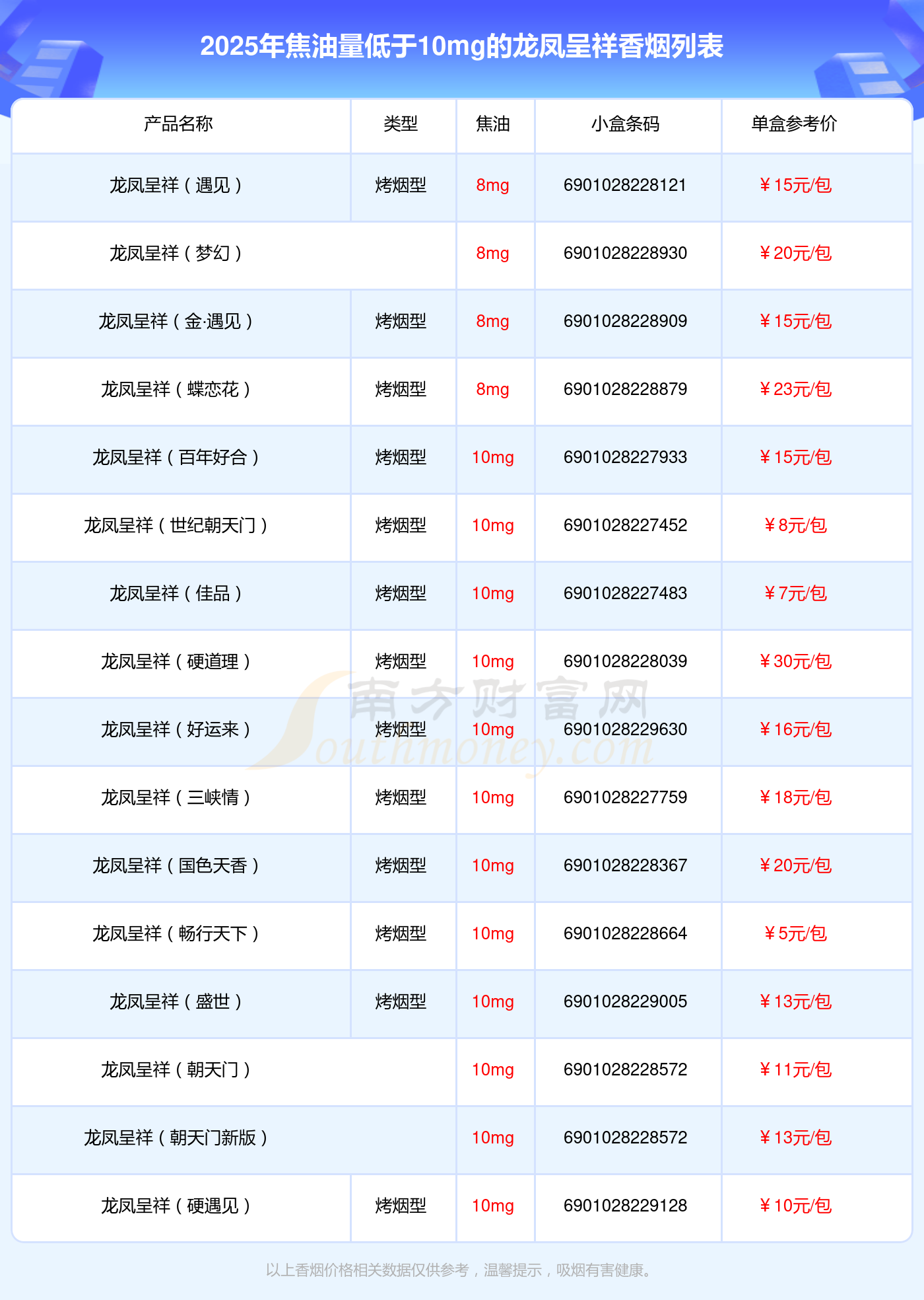 擇煙網(wǎng)為大家盤點(diǎn)了焦油量低于10mg的龍鳳呈祥香煙,有龍鳳呈祥(遇見)、龍鳳呈祥(夢(mèng)幻)、龍鳳呈祥(金·遇見)、龍鳳呈祥(蝶戀花)、龍鳳呈祥(百年好合)、龍鳳呈祥(世紀(jì)朝天門)、龍鳳呈祥(佳品)、龍鳳呈祥(硬道理)、龍鳳呈祥(好運(yùn)來)、龍鳳呈祥(三峽情)等,詳細(xì)價(jià)格如下: