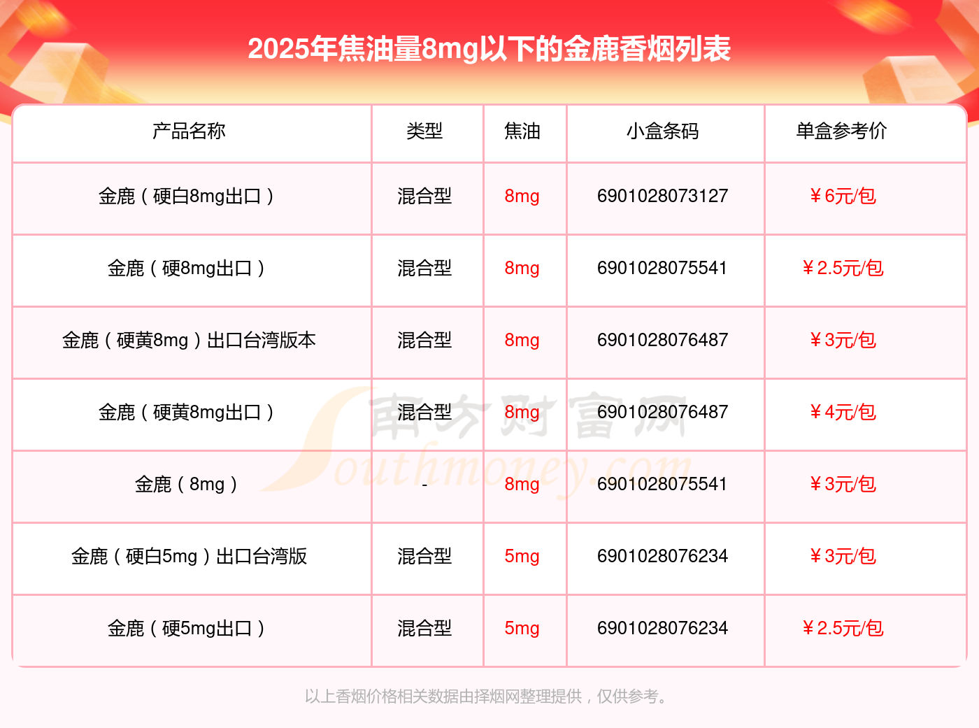擇煙網(wǎng)為大家盤點了金鹿香煙焦油量8mg以下的,分別有金鹿(硬白8mg出口)、金鹿(硬8mg出口)、金鹿(硬黃8mg)出口臺灣版本、金鹿(硬黃8mg出口)、金鹿(8mg)、金鹿(硬白5mg)出口臺灣版、金鹿(硬5mg出口)等,具體價格如下: