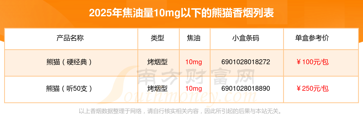 焦油量10mg以下的熊貓香煙有哪些?擇煙網(wǎng)為大家整理盤點(diǎn),分別有:熊貓(硬經(jīng)典)、熊貓(聽50支)等,具體價格如下: