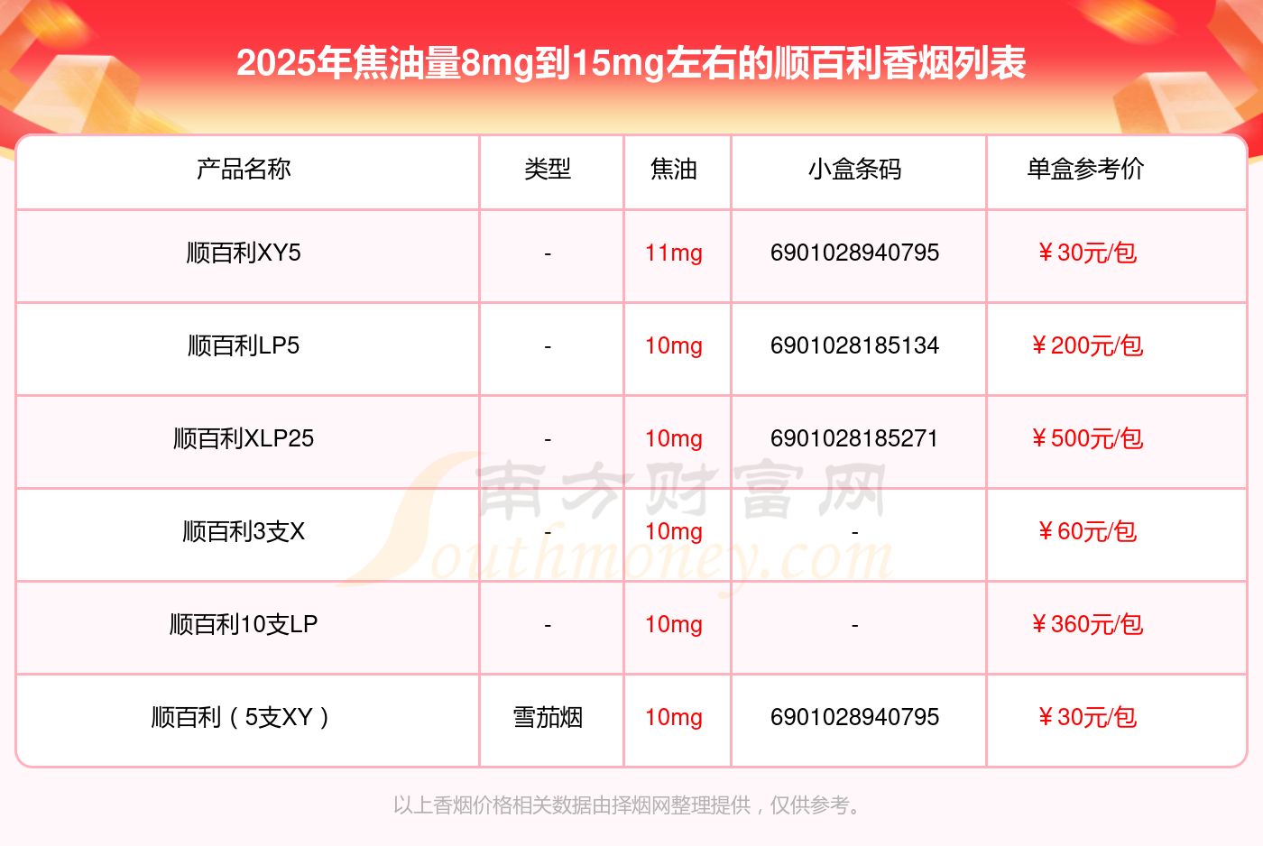 順百利香煙焦油量8mg到15mg左右的煙分別有順百利XY5參考價30元/包、順百利LP5參考價200元/包、順百利XLP25參考價500元/包、順百利3支X參考價60元/包、順百利10支LP參考價360元/包、順百利(5支XY)參考價30元/包等。